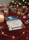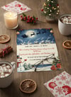 Create magical holiday memories with this festive Christmas dinner party invitation template. Features a charming winter scene with Santa's sleigh silhouetted against a full moon, snow-covered village houses, and delightful seasonal decorations including a snowman, Christmas tree, and wrapped gifts. The editable design includes space for your party details with whimsical "Come Eat, Laugh & Be Merry" header. Perfect for hosting Christmas dinners, holiday gatherings, festive celebrations, and seasonal parties. Customize with your event time, date, and location. Ideal for both digital invitations and printable cards. This vintage-inspired Christmas invite template creates the perfect first impression for your holiday entertaining, combining traditional Christmas imagery with modern, editable convenience for easy personalization.