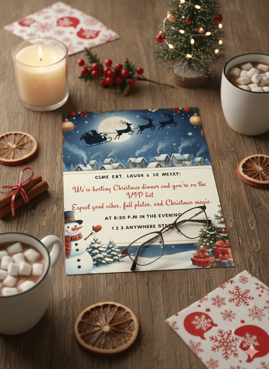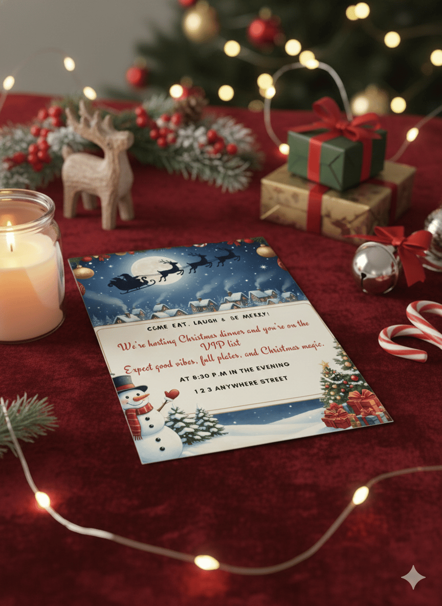 Christmas Dinner Party Invitation Template - Editable Holiday Invite Card with Santa Sleigh Design
