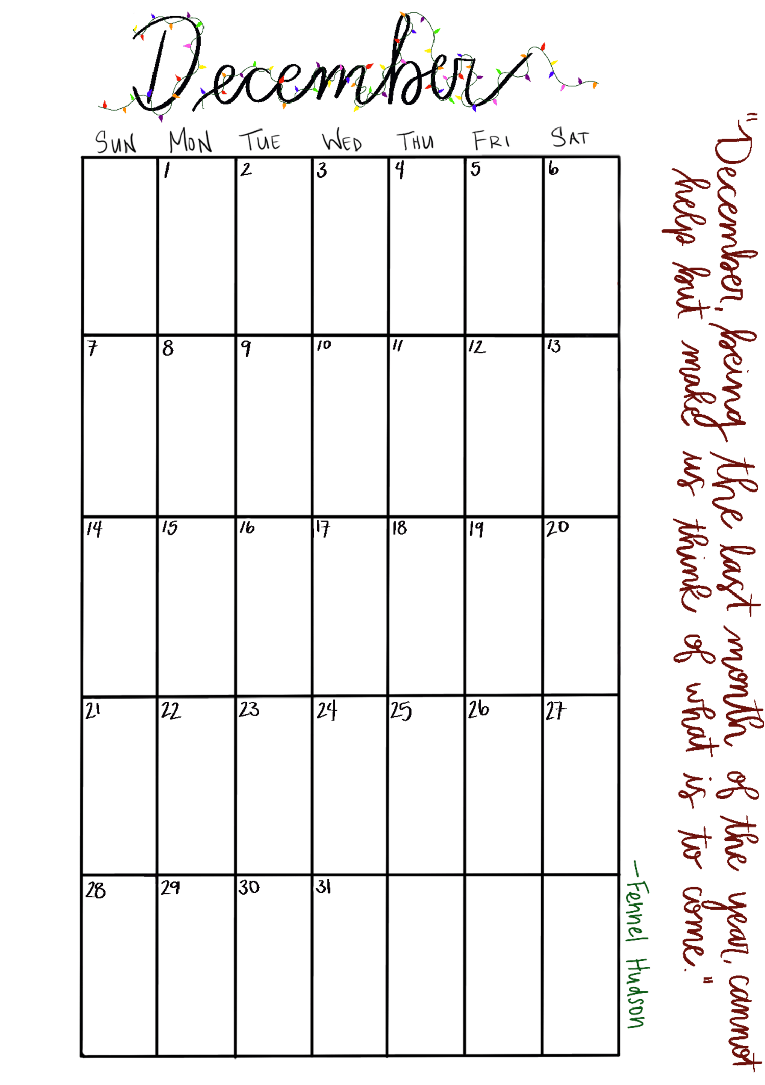 - A5 + A6 styled December calendar (colored + hand-lettered)