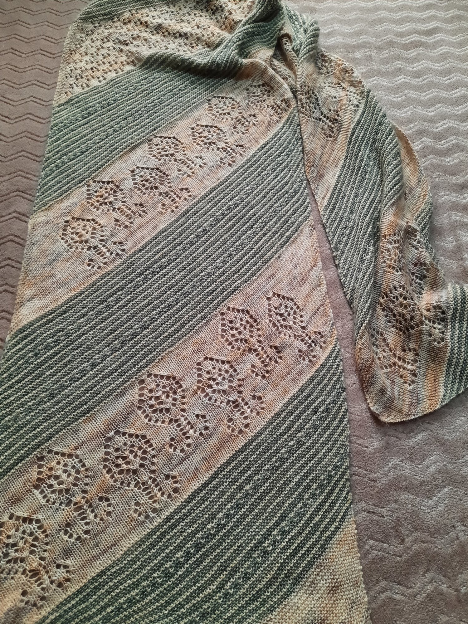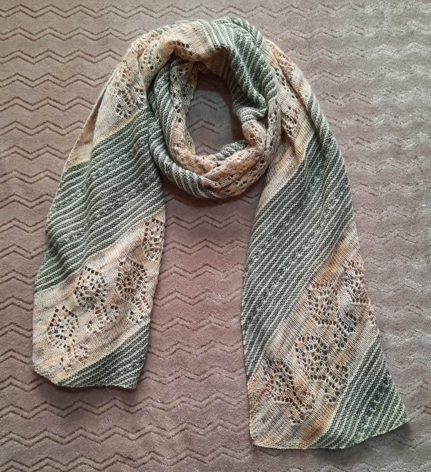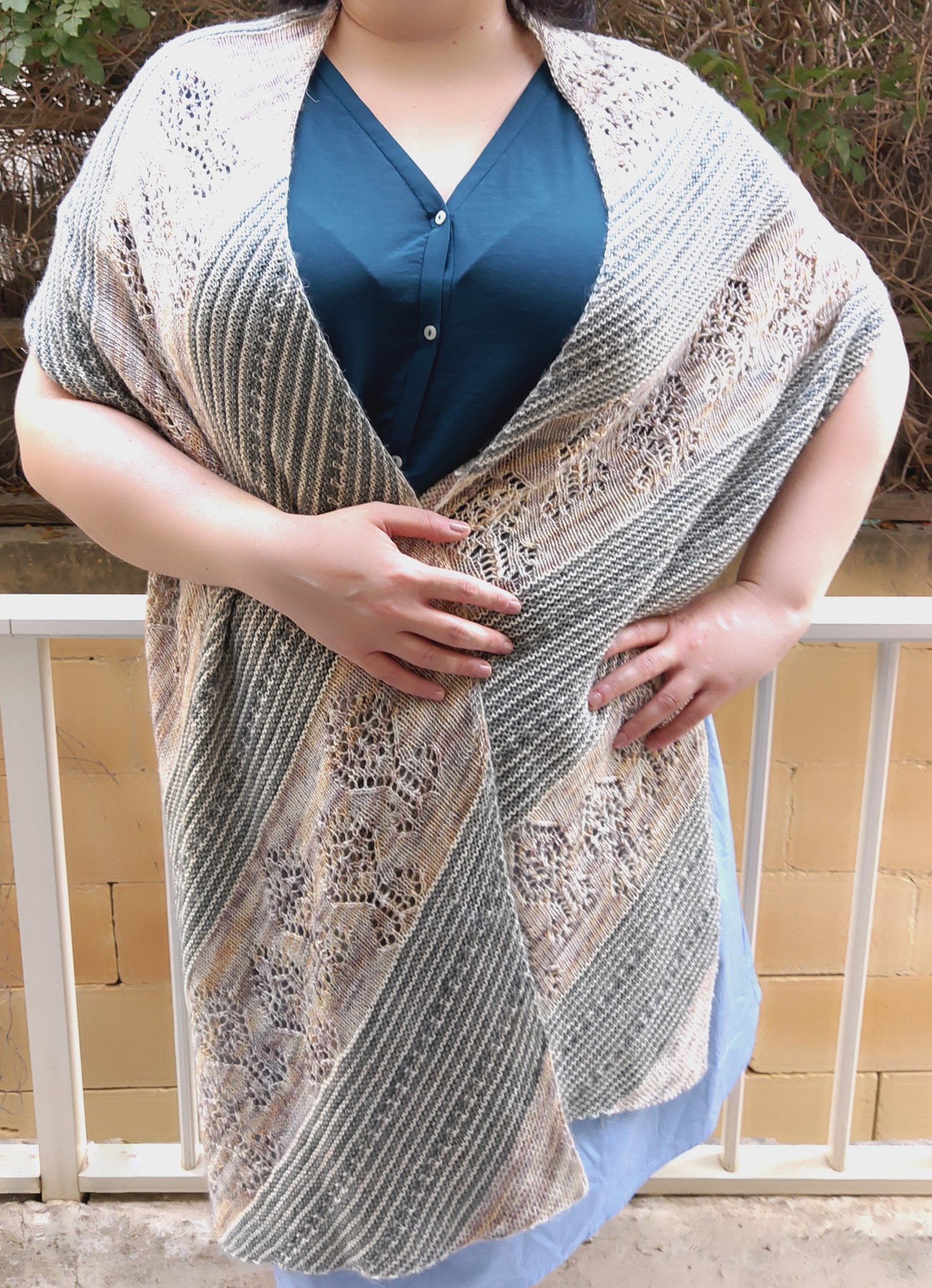 This is a light and floaty fingering weights rectangular wrap, very versatile to wear, is knit from corner to corner, meaning no large cast on or kind off number of stitches. The stitch count stabilises and remains the same for a large part of the wrap which allows for modification in length if desired. The design is worked on a balanced plan to provide equal amounts of engagement of comfort, featuring natured themed easy to work lace sections separated by cosy Garter stripes sequences interspersed with slipped stitches patterned rows to add interest. I would recommend two tonal/solid shades for the garter stripe combination and whatever yarn you love for the lace sections. Whether delicately draped over the shoulders to provide some light cover or layered around the neck cosy scarf style, formal or casual, it makes a great versatile useful interesting wardrobe piece for many occasions.