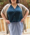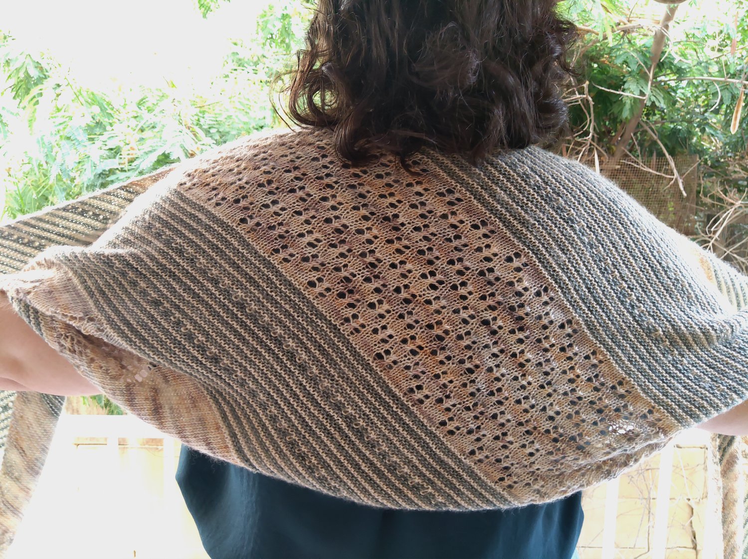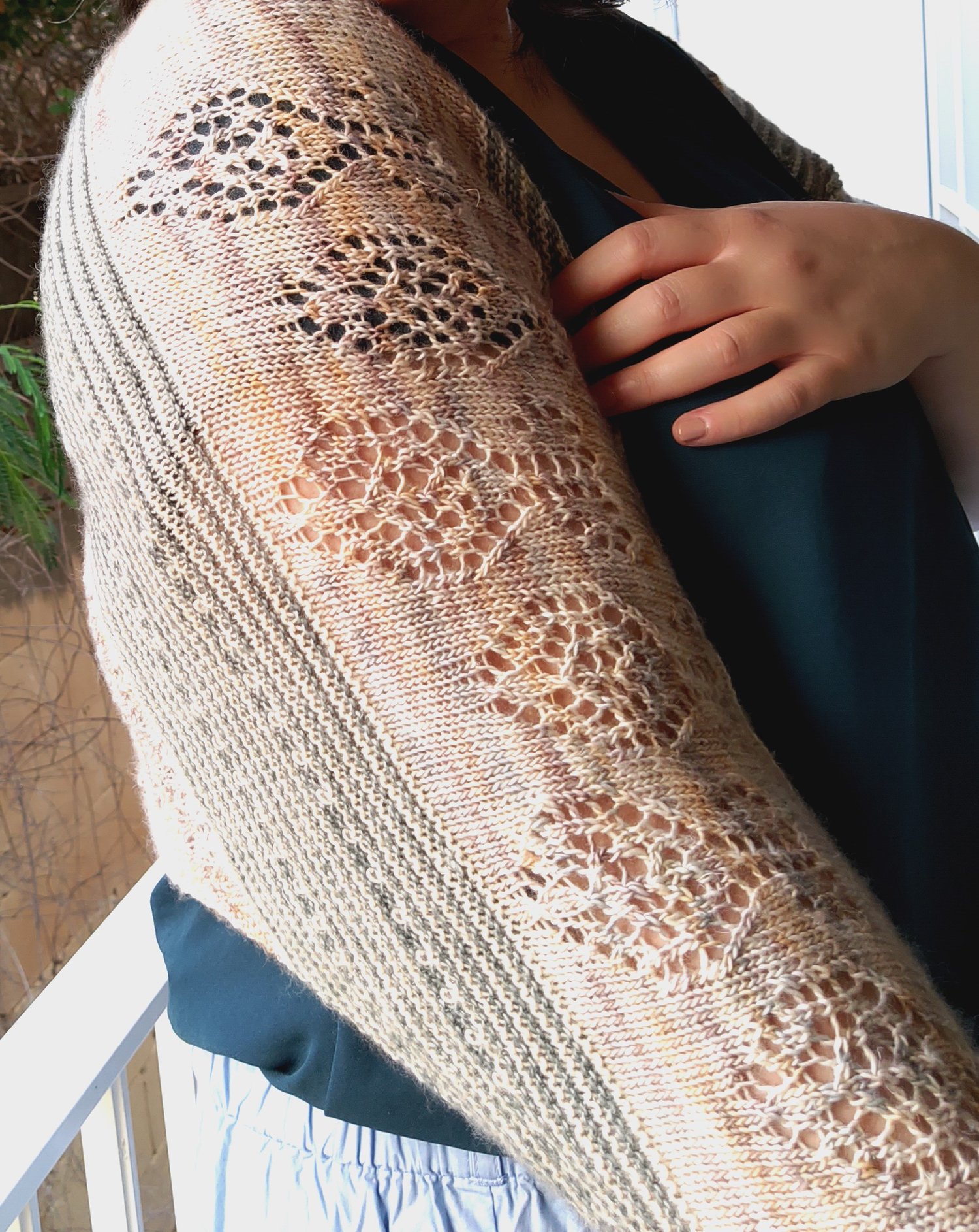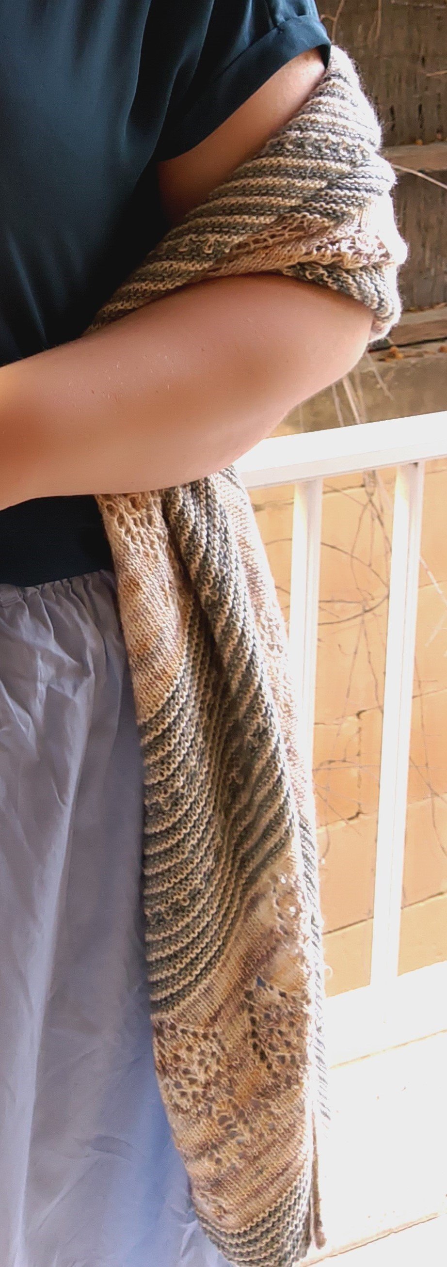 This is a light and floaty fingering weights rectangular wrap, very versatile to wear, is knit from corner to corner, meaning no large cast on or kind off number of stitches. The stitch count stabilises and remains the same for a large part of the wrap which allows for modification in length if desired. The design is worked on a balanced plan to provide equal amounts of engagement of comfort, featuring natured themed easy to work lace sections separated by cosy Garter stripes sequences interspersed with slipped stitches patterned rows to add interest. I would recommend two tonal/solid shades for the garter stripe combination and whatever yarn you love for the lace sections. Whether delicately draped over the shoulders to provide some light cover or layered around the neck cosy scarf style, formal or casual, it makes a great versatile useful interesting wardrobe piece for many occasions.