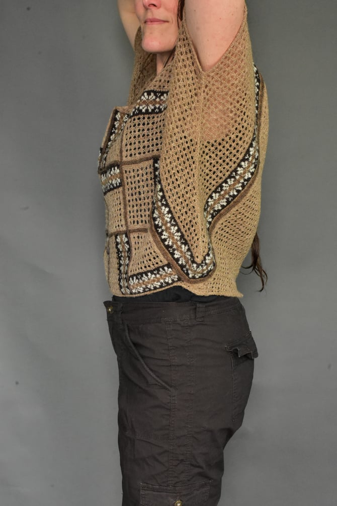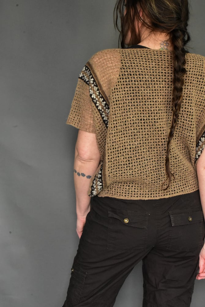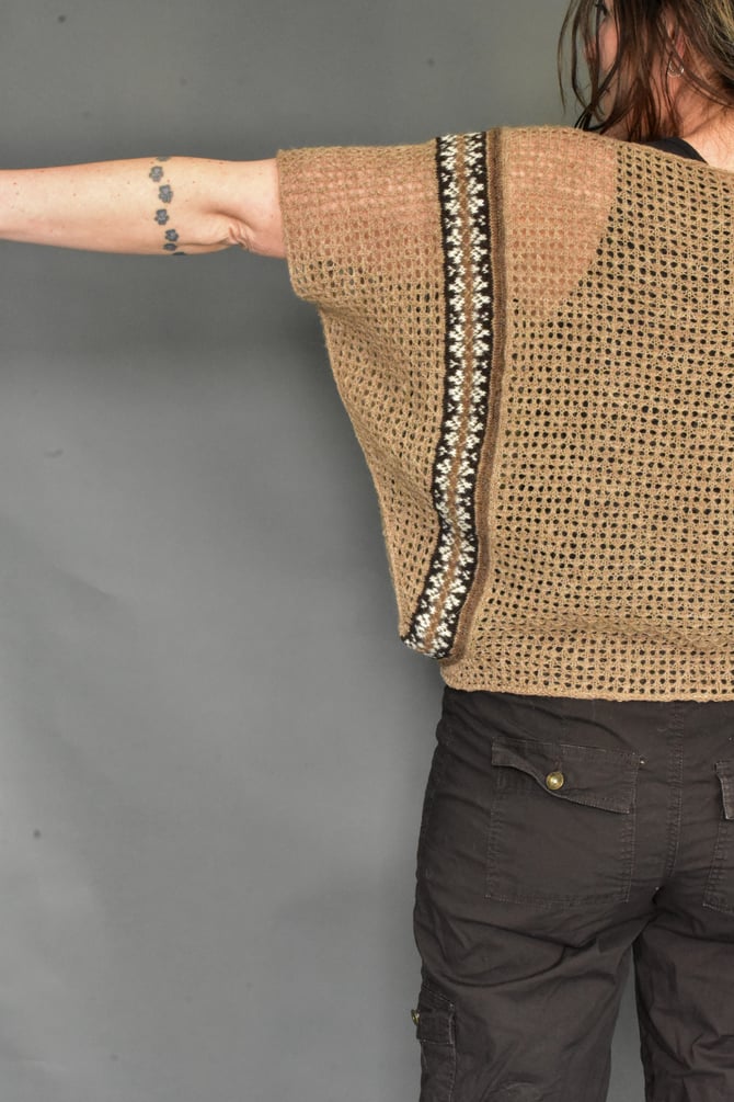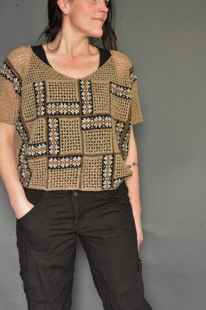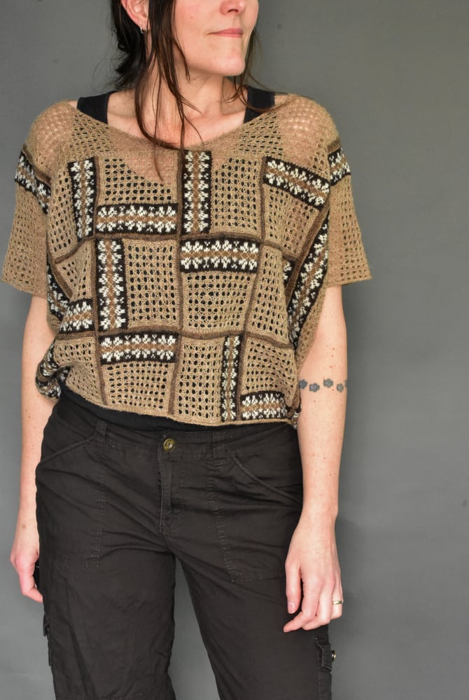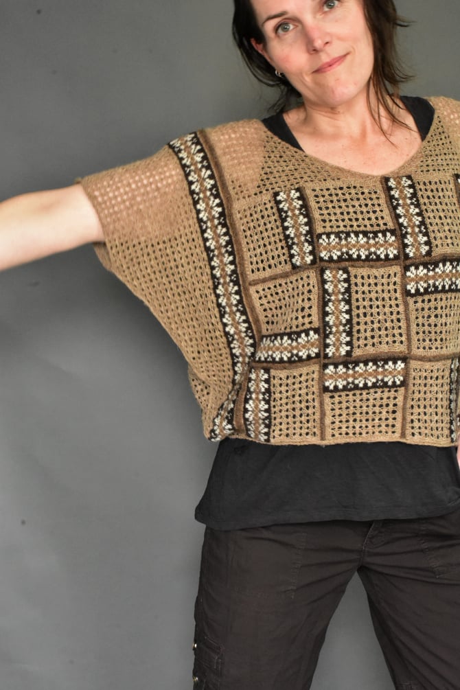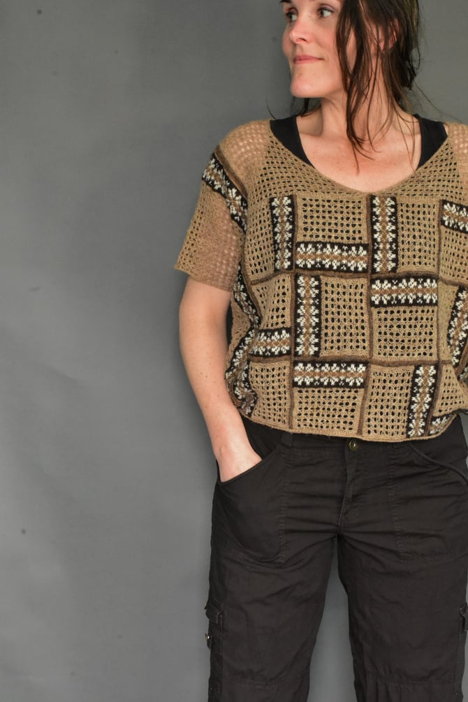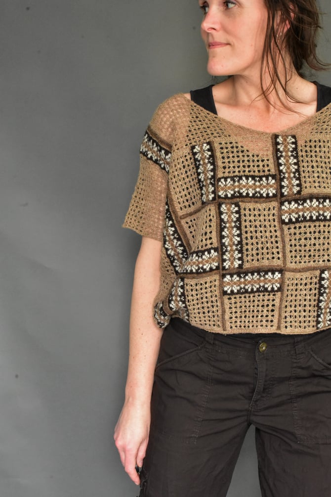 Cappahayden is a modular dolman tee showcasing a patchwork interplay of Fair Isle and simple lace. The patchwork squares are worked first and joined. The remaining front and back body lace is worked flat and then stitches are picked up and the dolman sleeves are worked in the round. This cool and cropped summer overlay is so great over a camisole or summer dress.