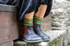 Tricotées en rond a partur du bord avec le jeu d’aiguilles à double pointe. Un motif décoratif (réalisé sur 4 tours) agrémente la partie antérieure des chaussettes, et se termine en pointe sur le cou de pied en rappelant la forme allongée et fuselée de la feuille d’agave. Les chaussettes sont construites avec le talon hollandais et la pointe à la française, ce qui les rend très simples d’exécution.