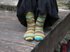 Knitted in the round from the cuff down on DPNs. The front of the sock is highlighted by a decorative pattern (worked on 4 rounds) that ends in a point on the foot, reminding a long and pointed agave leaf. The socks sports Dutch heel and French toe, which makes them quite easy to knit.