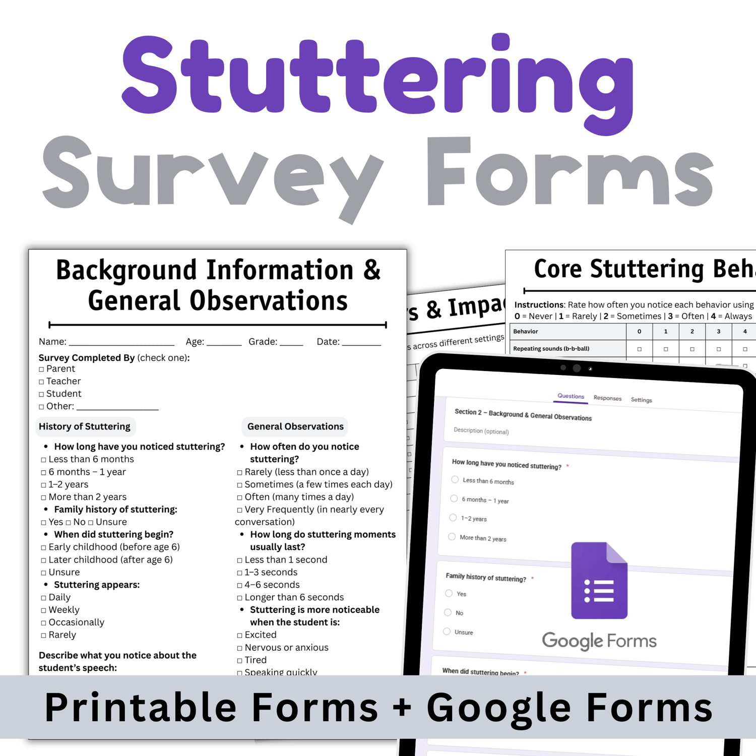 This Stuttering Survey gives SLPs, teachers, and parents an easy way to gather observations in a supportive, professional format. It comes in both printable worksheets and a Google Forms version for quick, digital use.