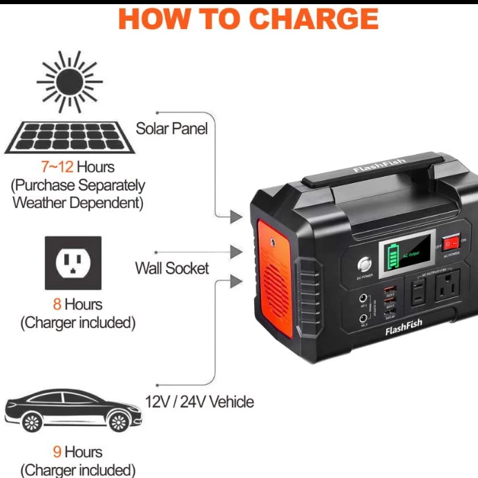 Triple Rechargeable Modes Efficient Solar Generator: FlashFish power station is equipped with a lithium battery pack, it can be charged by the 15-24 volt solar panel (not included), AC wall adapter and car charger efficiently. No memory effect, no worry about battery capacity reduction