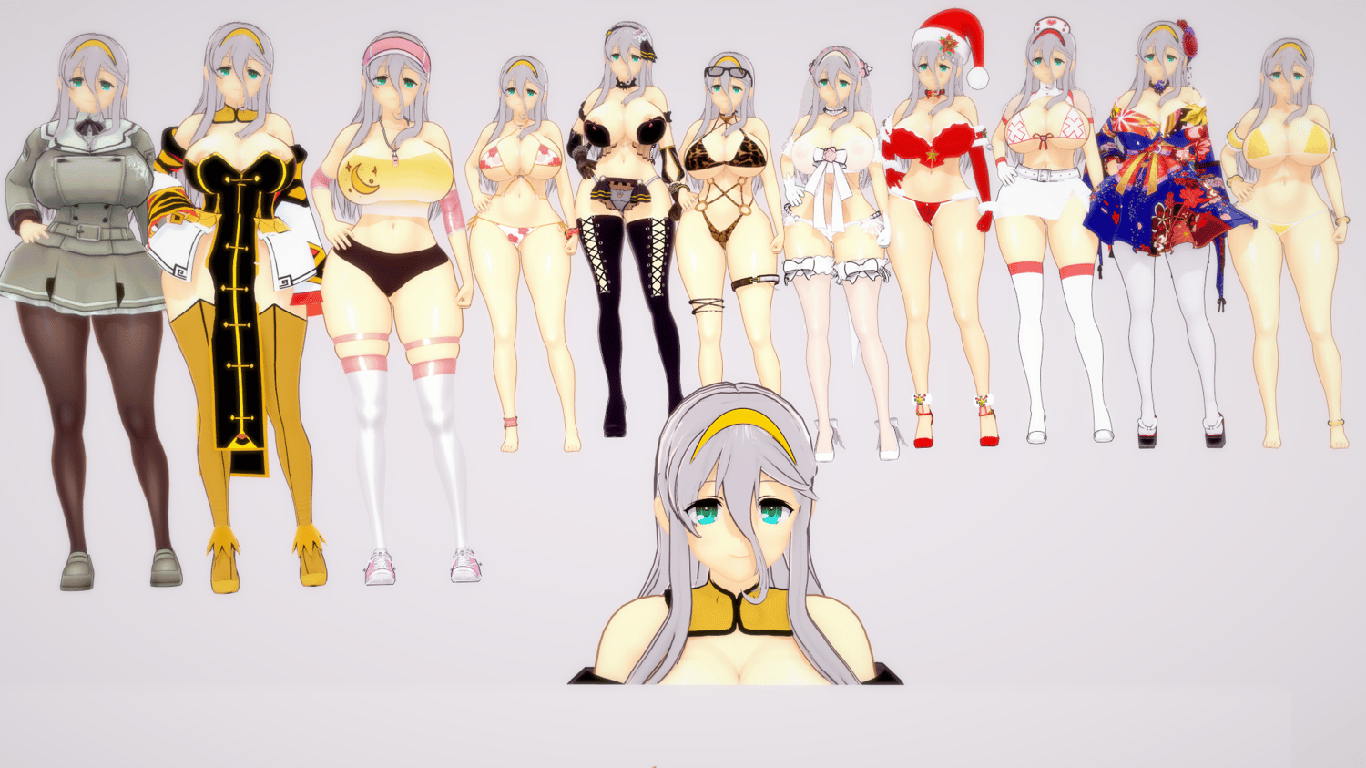 Gekkou includes various costumes: normal, shinobi, bikini, weeding, christmas, lingerie black, bikini leopard, Santa, Nurse, Kimono, sport, Yellow bikini.