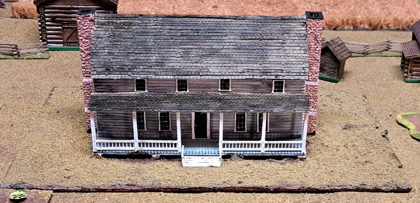 For the 1781 skirmish, the House on Horseshoe Bend was a distinctive building. It was a two story structure with a front and back porch with two chimneys. The house still stands today and is a state park in North Carolina. Using measurements taken from Google Earth images, I have attempted to recreate this building as a 3d model. The house comes in a number of separate pieces.