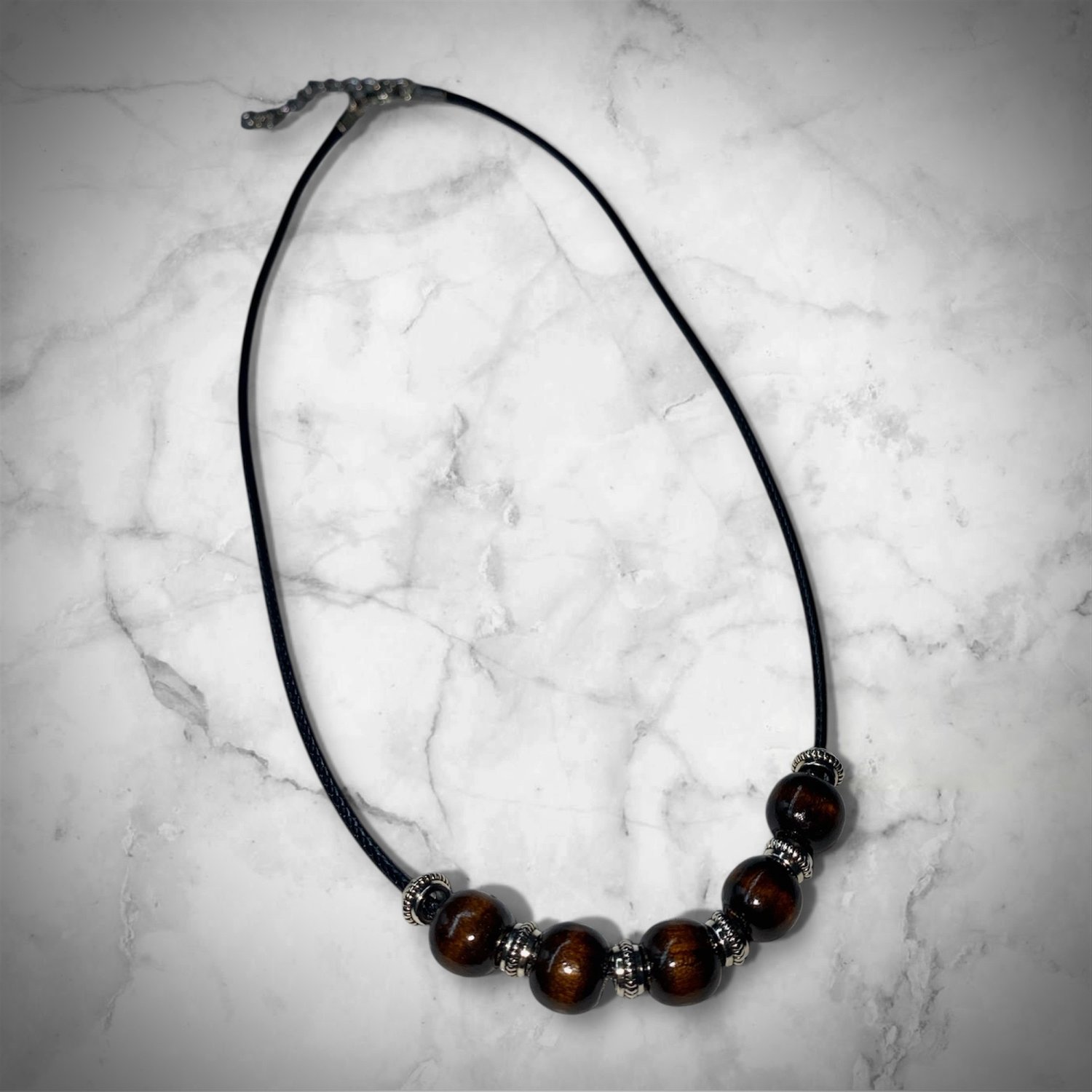 Make a bold yet natural statement with this handcrafted wood bead necklace, designed for effortless style and everyday wear. Featuring rich, polished wooden beads accented with antique silver spacers, this necklace is strung on a sleek black cord for a modern, minimalist finish.
