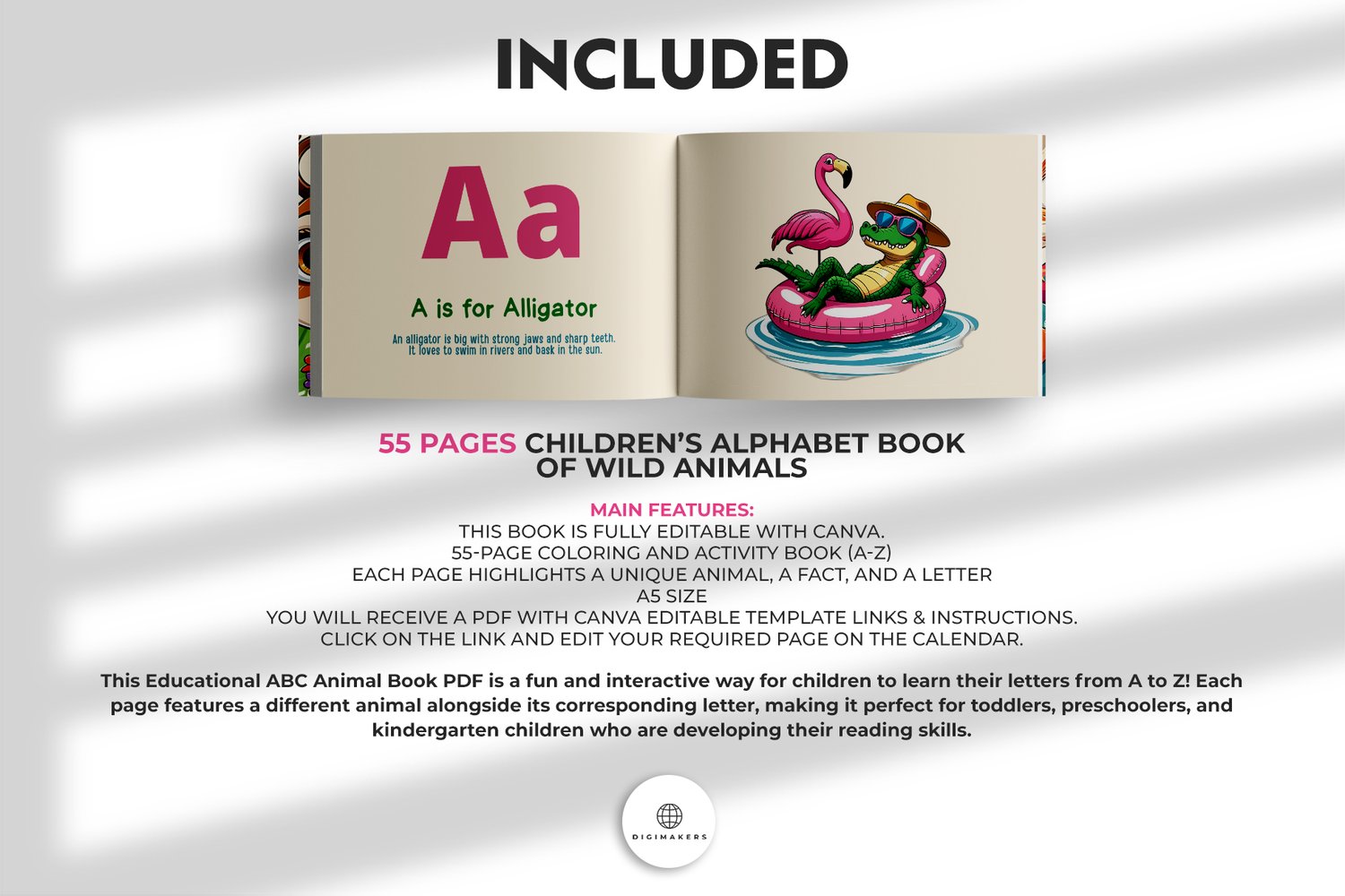 This Children’s Alphabet Book of Wild Animals is a fun and interactive way for children to learn their letters from A to Z! Each page features a different animal alongside its corresponding letter, making it perfect for toddlers, preschoolers, and kindergarten children who are developing their reading skills.