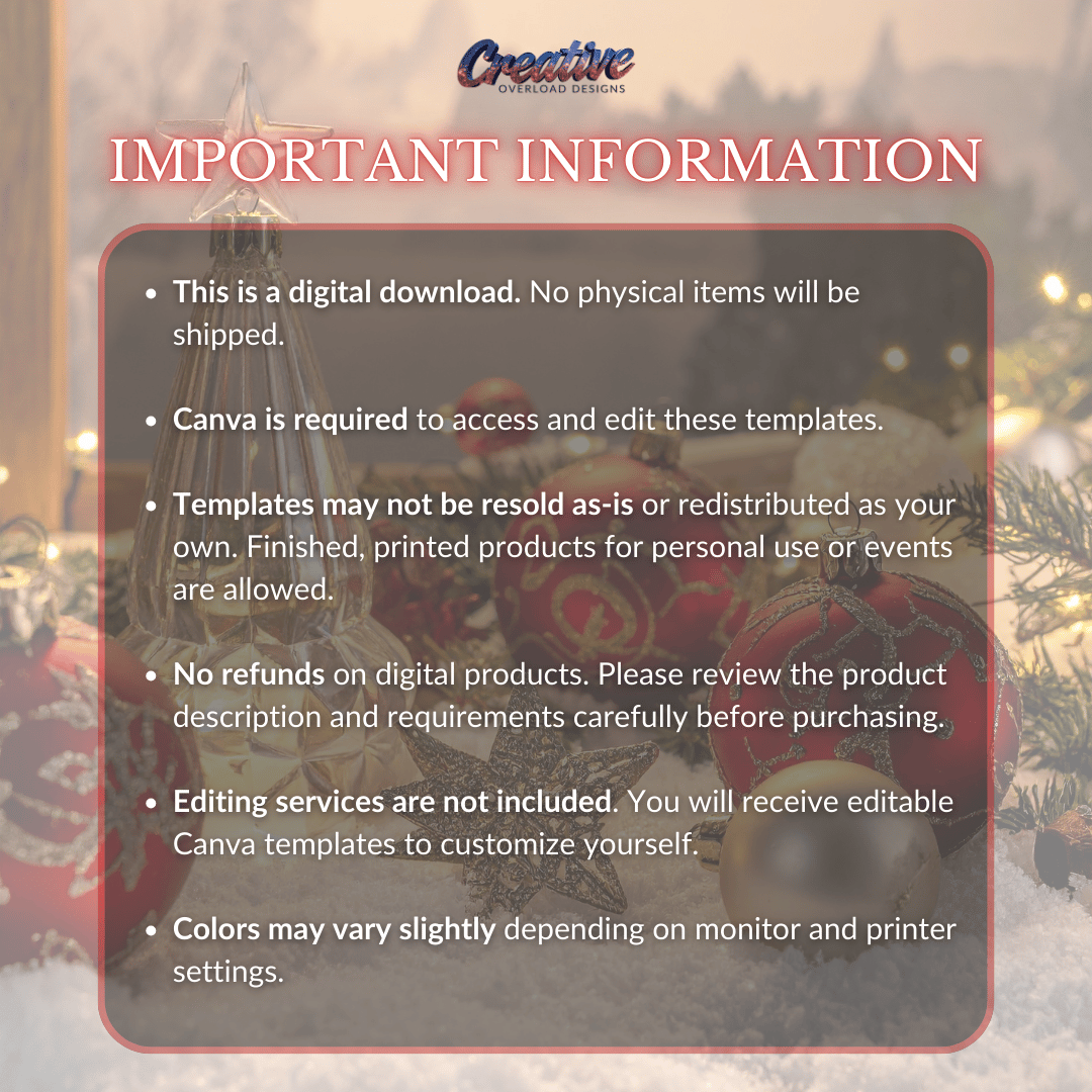 Templates may not be resold as-is or redistributed as your own. Finished, printed products for personal use or events are allowed.