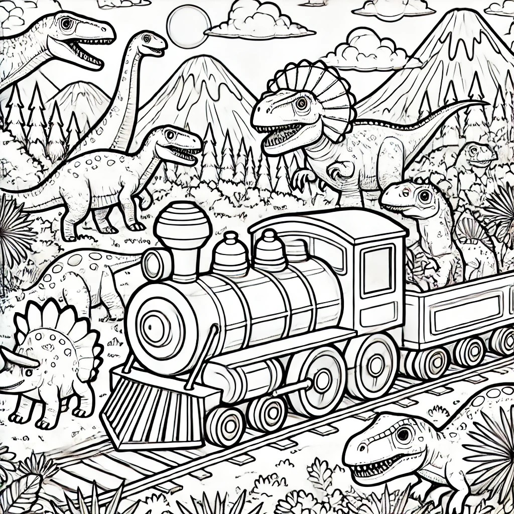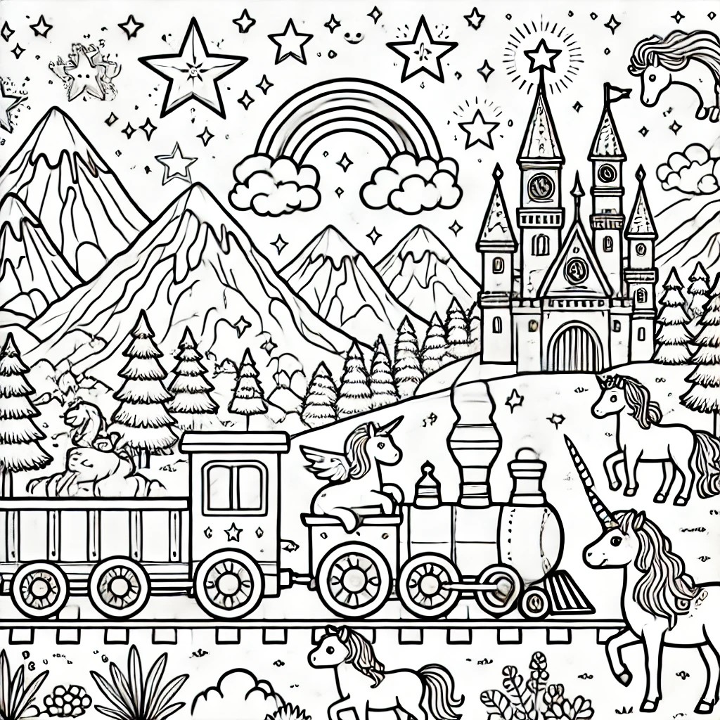 magical train adventure, whimsical coloring book, children's activity book, fantasy landscapes, animal passengers, fairy tale trains, holiday themes, space adventure, underwater scenes, jungle exploration, medieval castles, rainbow patterns, candy land, friendly conductors, hot air balloons, prehistoric world, safari animals, birthday celebrations, cloud trains, playful illustrations