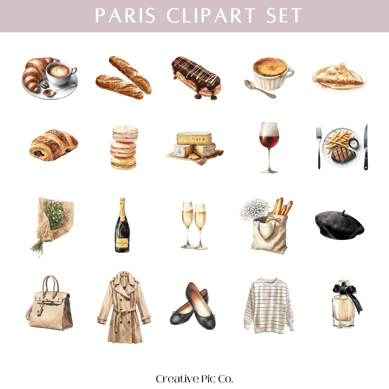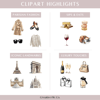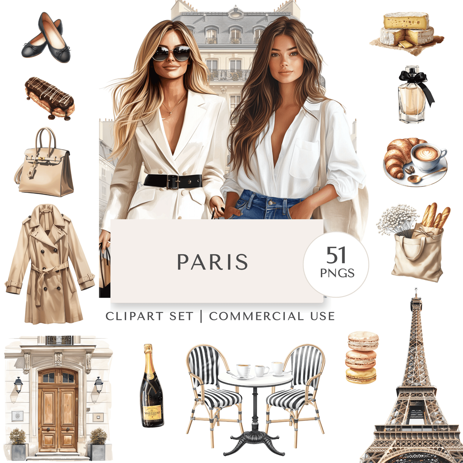 Stylish Paris clipart set with 51 PNGs featuring French fashion, landmarks, champagne, croissants & more. Perfect for digital planning, travel content, branding & lifestyle design. Neutral tones & transparent backgrounds. Instant download + commercial license.
