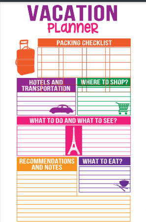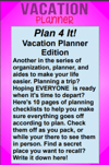 Another in the series of Organizers, Planners, and Journals to make your life easier. Going on vacation? Why is it that every time it falls to ONE person to plan it, pack for it, and make sure everyone's items are there when they want them so THEY can enjoy it? Never allows the person who does all that work to relax and enjoy that vacation. What's the answer to this dilemma? A Vacation PLANNER! Here it is. With everyone having their own page, it becomes an easier task to make sure everyone HAS what they need, and/or want. Allows everyone to enjoy it and not stress Mom or Dad over it.
