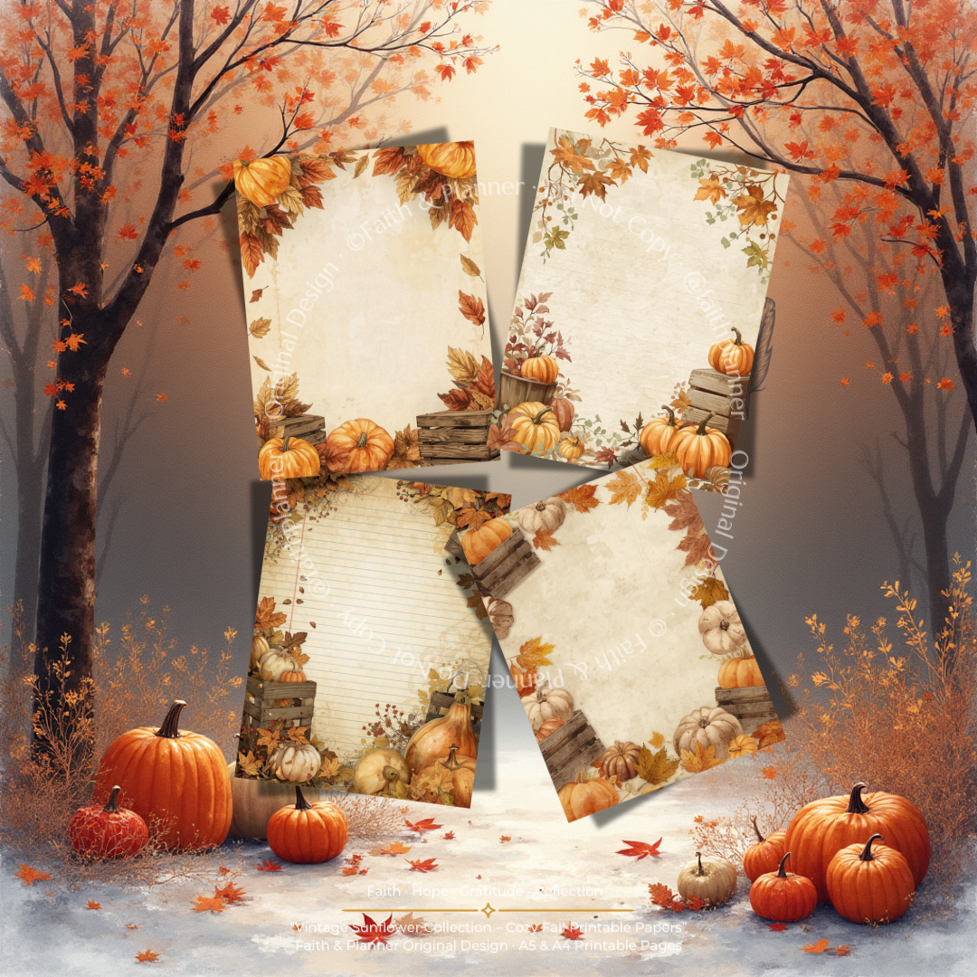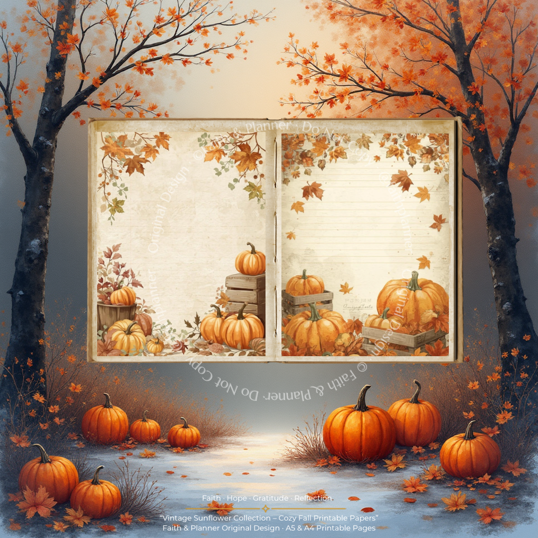 Each page blends rustic pumpkin tones, vintage textures, and soft golden light — creating that cozy, nostalgic atmosphere of the harvest season.