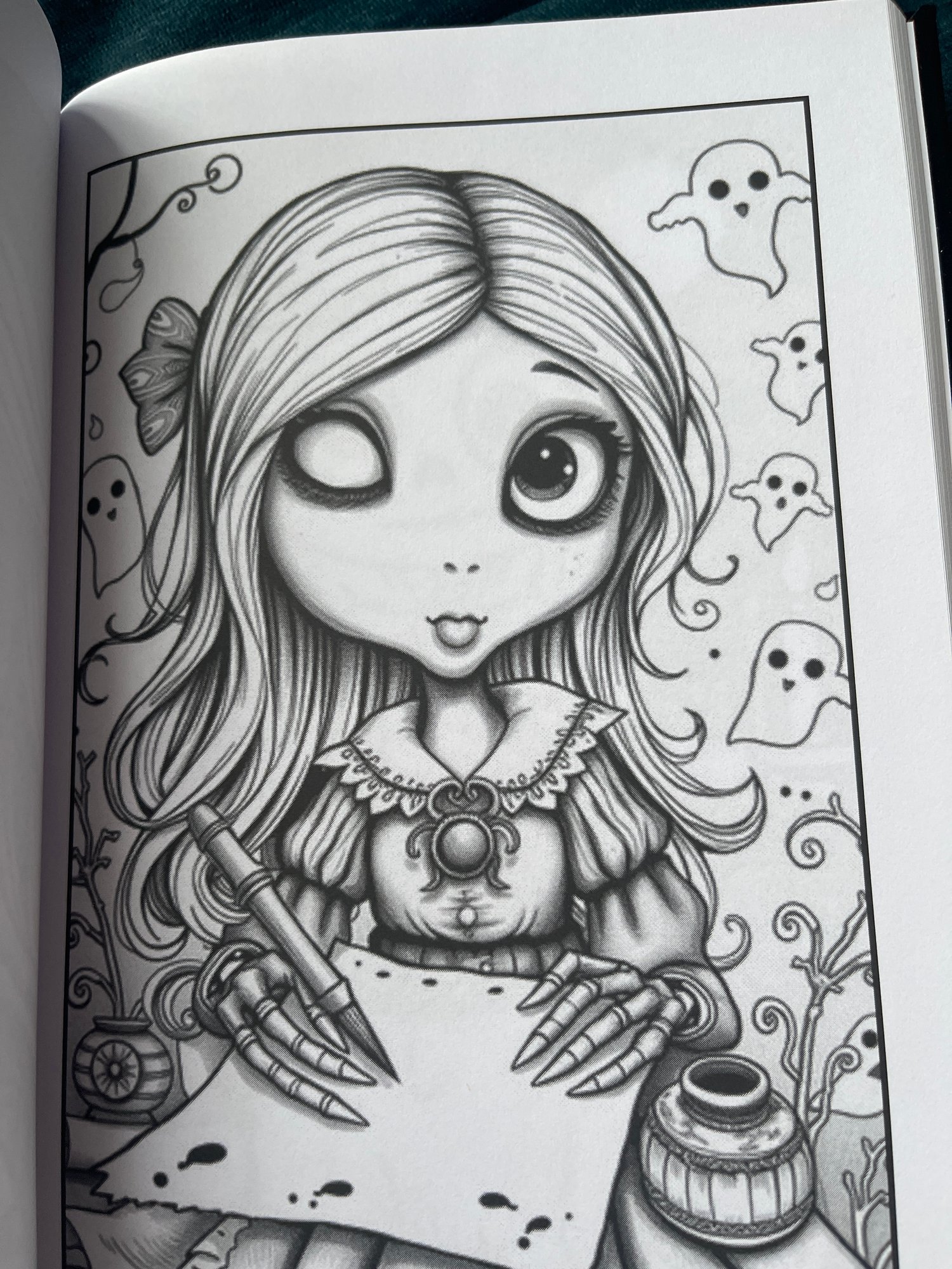 Enter the darker side of colouring with Morticia Vain’s Cozy Spooky Girl moments.