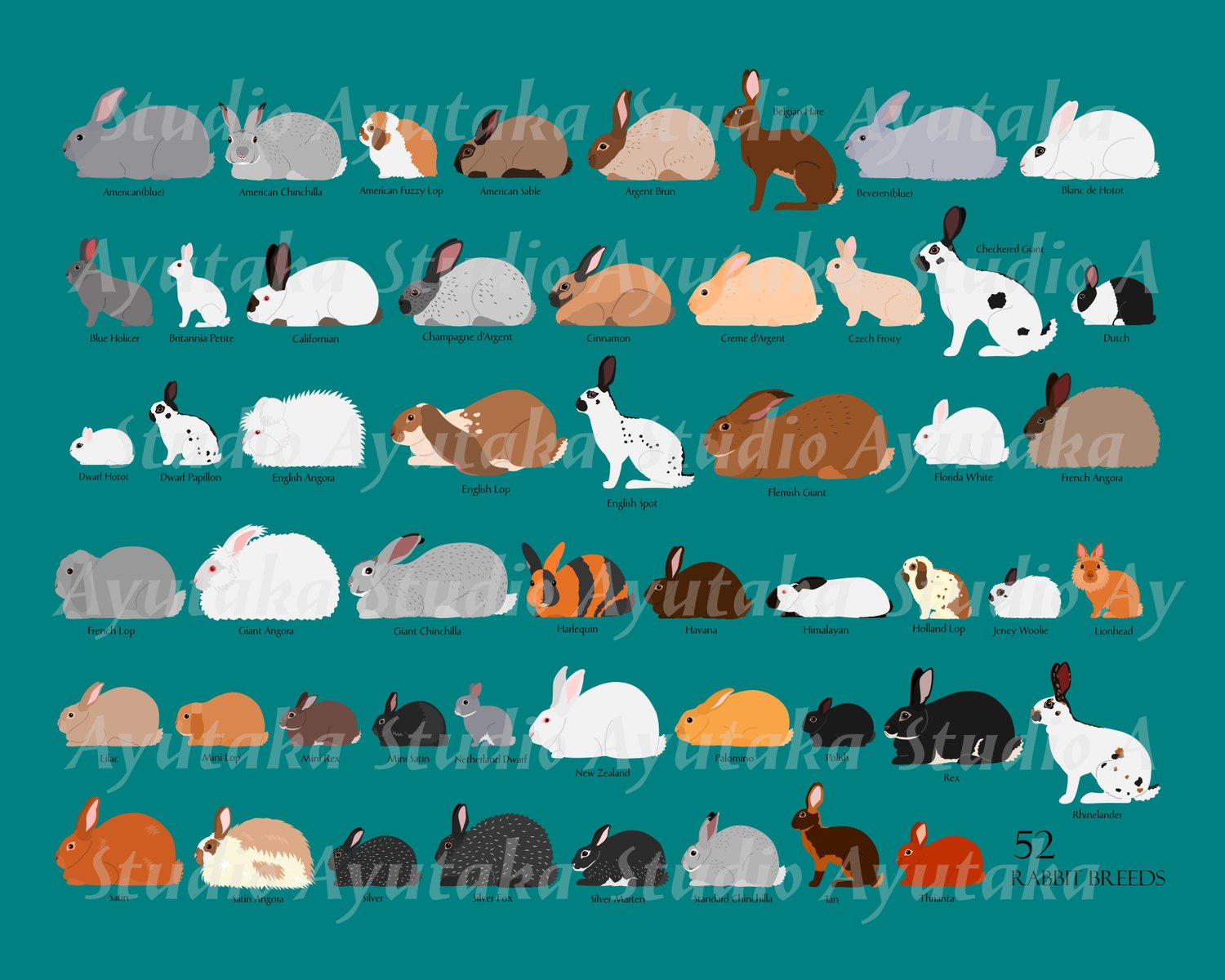 Download your "52 Rabbit Breeds Chart" today and celebrate the wonderful diversity of the rabbit world! Perfect for bunny decor, rabbit gifts, or adding a touch of animal-themed charm to your space. Get yours now and let your love for rabbits shine!