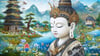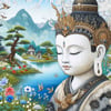 A beautiful Buddha boy beside a blue lake with flowers, mountains, & humming birds.