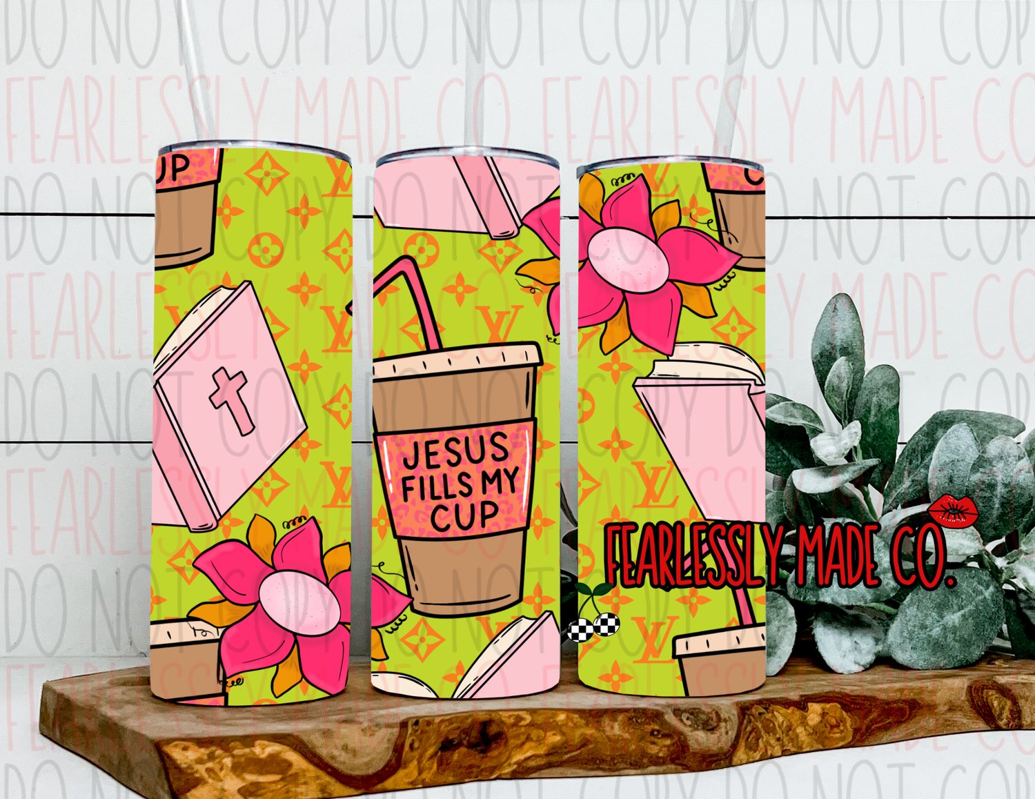 It holds 20 oz of your favorite beverage; has a plastic lid and comes with a reusable straw.
