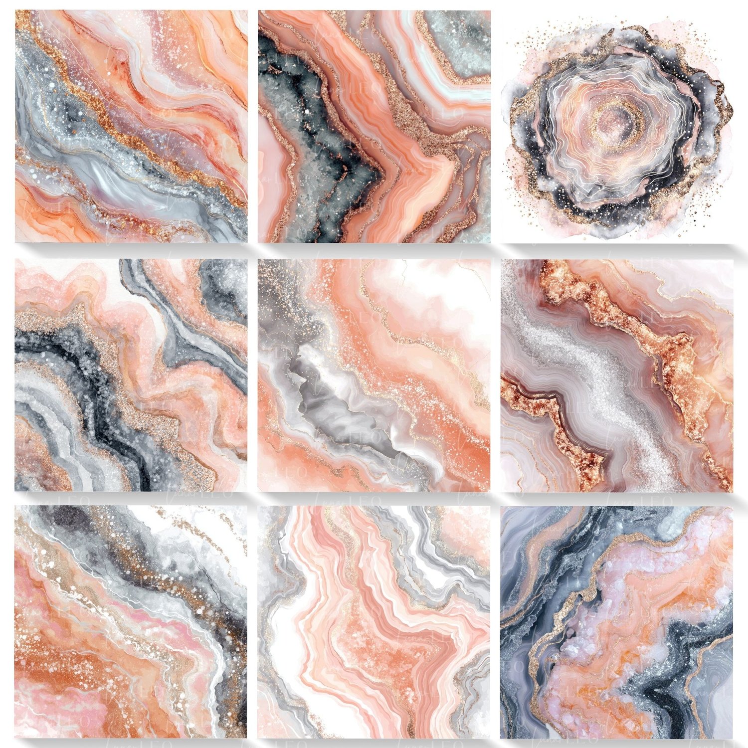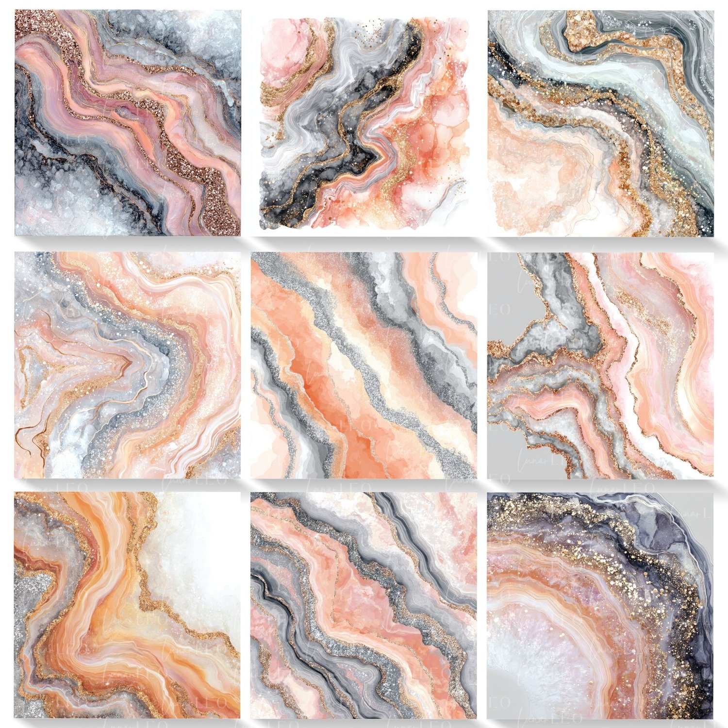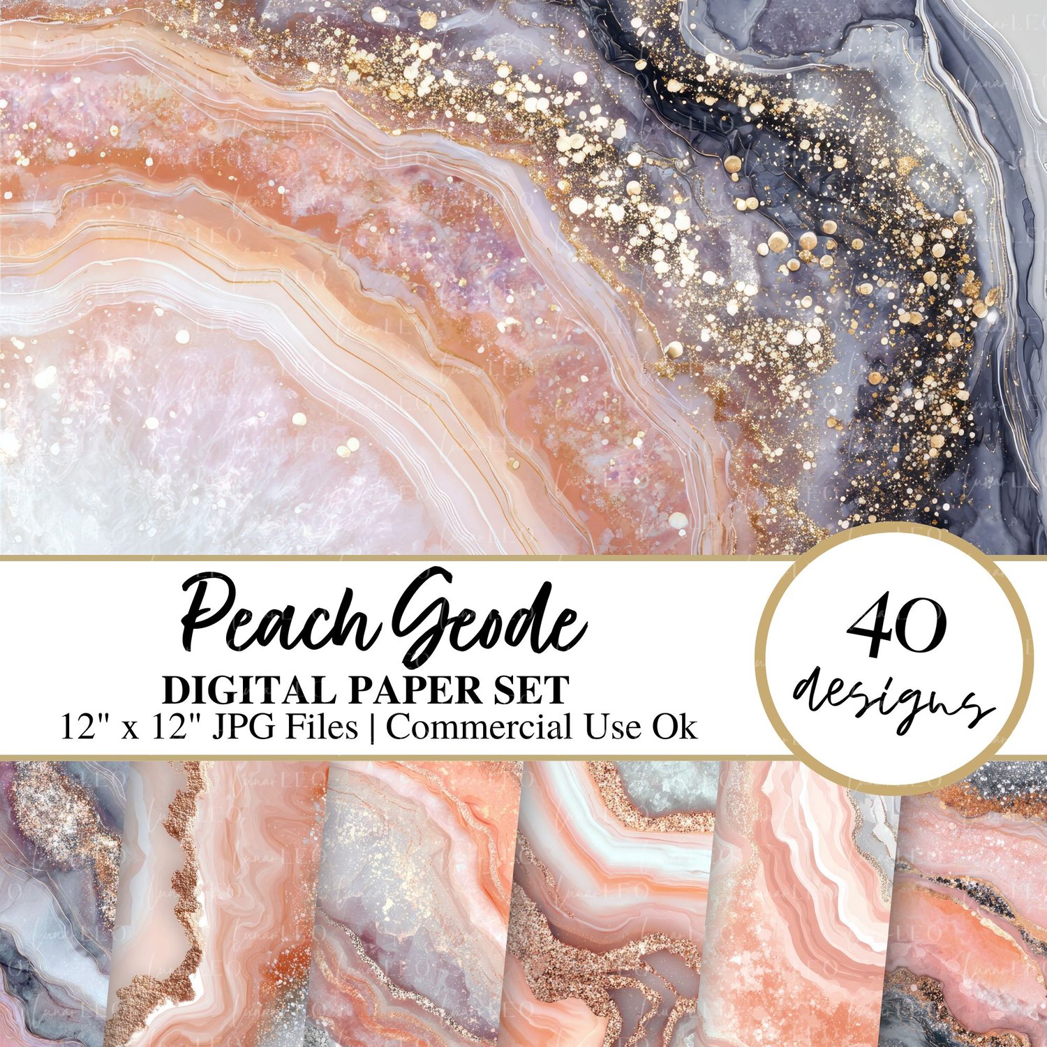 Elevate your creative projects with this Peach Geode Digital Paper Set, featuring soft peach, gray, and gold agate designs that shimmer with natural elegance. Each high-resolution JPG captures the layered look of real gemstone textures, perfect for creating sophisticated stationery, branding, invitations, wall art, and digital products.