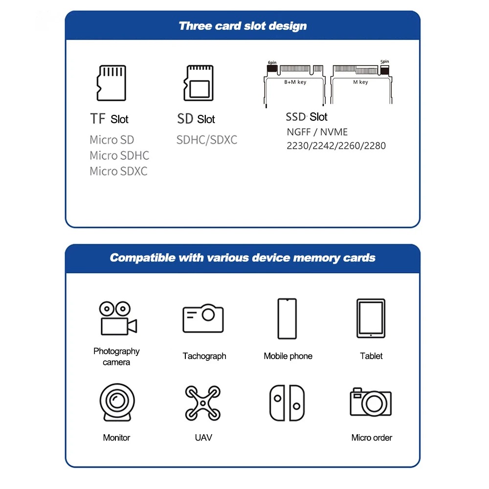 Partager Boîtier Externe SSD M.2 NVMe/NGFF – USB-C 10Gbps + Lecteur SD/TF MAC/PC/Phone