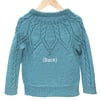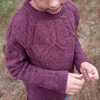 The sweater is worked top down in DK yarn, with short rows used to shape the neckline. Stitches are picked up under the arms before the torso and sleeves are worked in the round. The sleeves are worked last, also in the round.