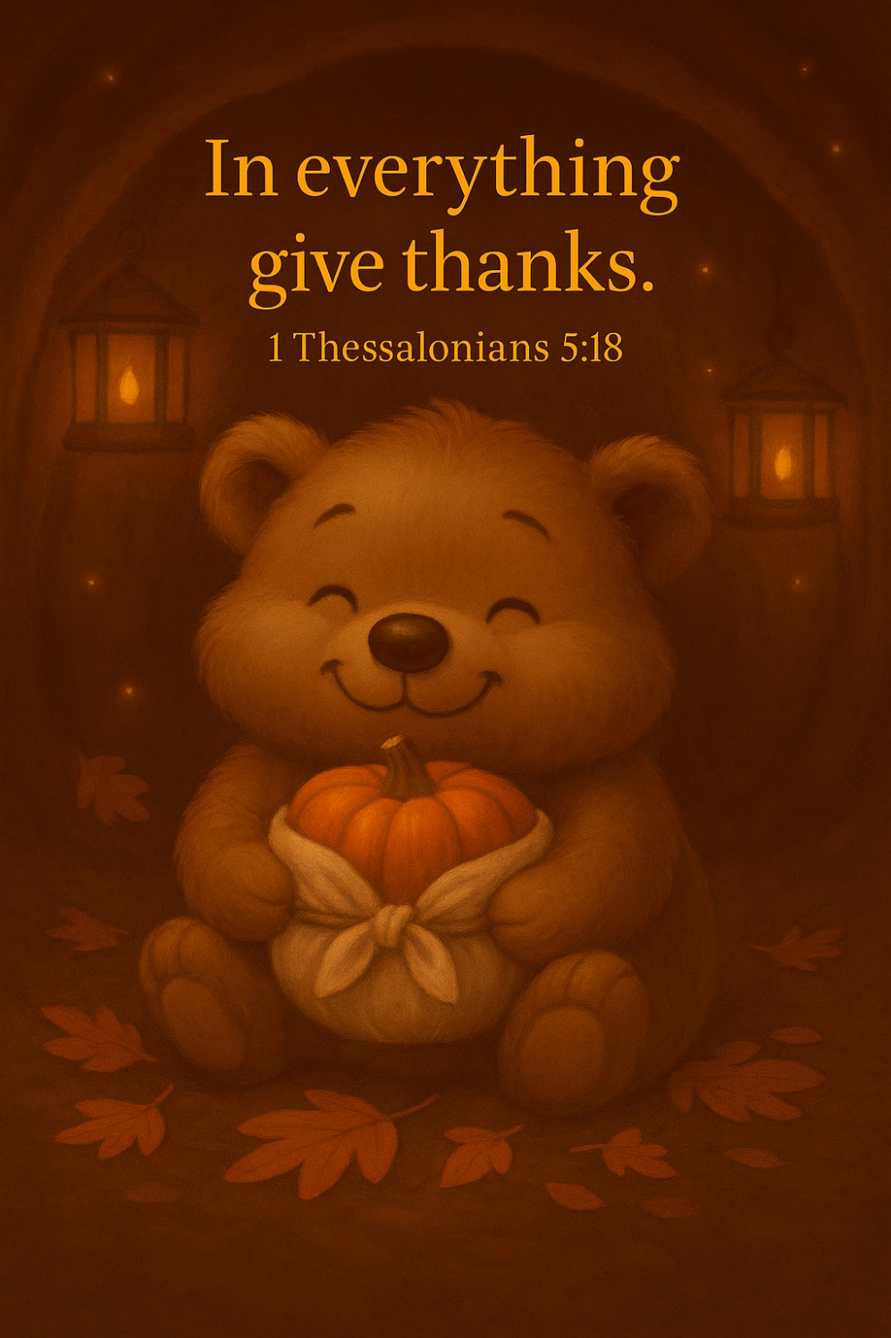 Wrap hearts in warmth with this Grateful Bear Scripture Poster, featuring a joyful woodland bear cradling a pumpkin amid glowing lanterns and autumn leaves. Anchored in 1 Thessalonians 5:18, this printable radiates comfort, thankfulness, and seasonal charm — perfect for Thanksgiving bundles, homeschool walls, or ministry kits.