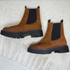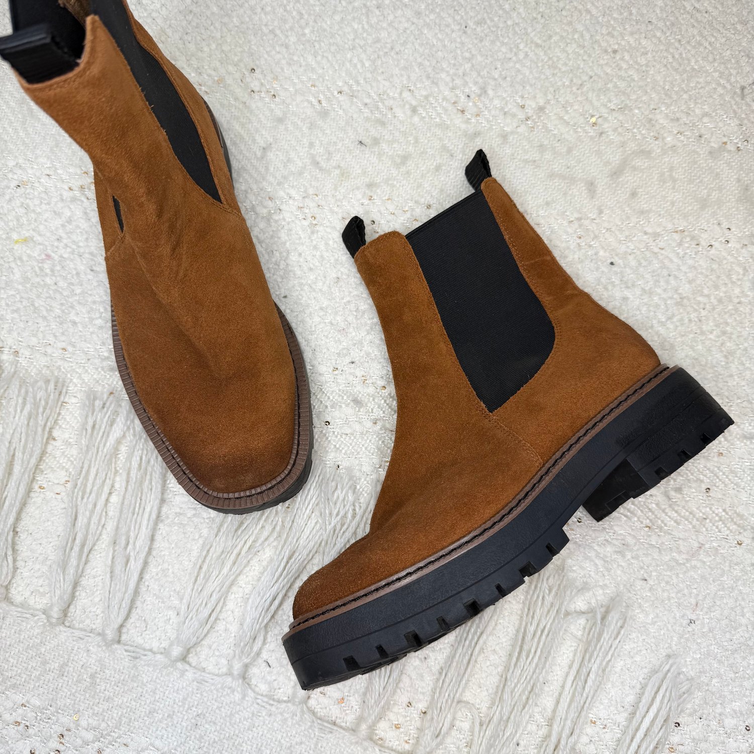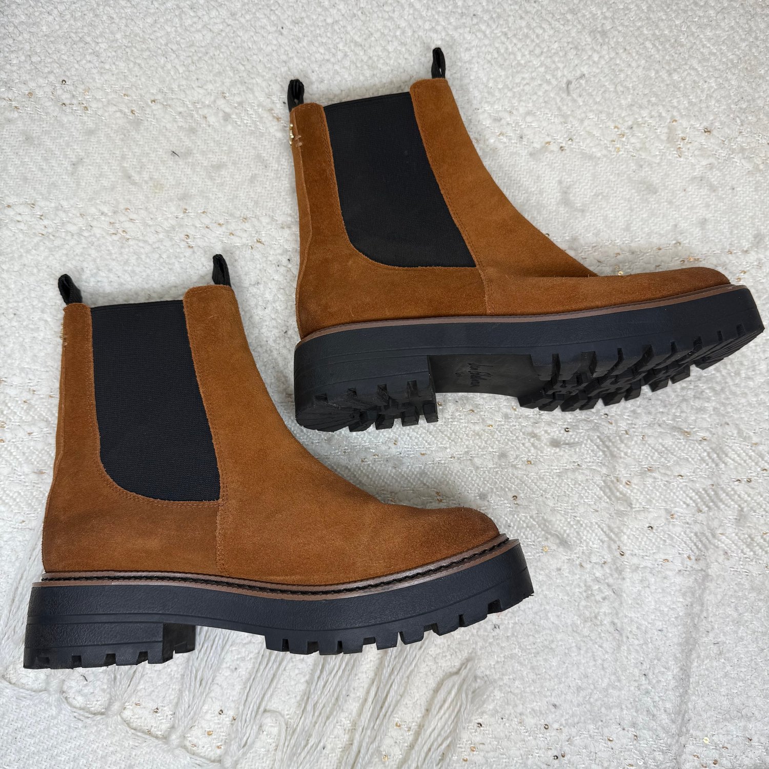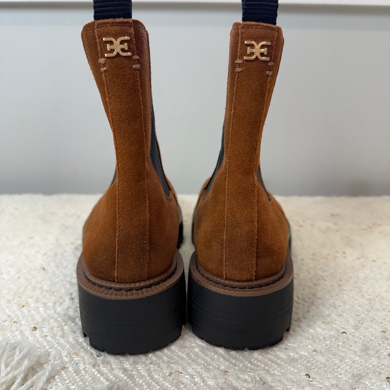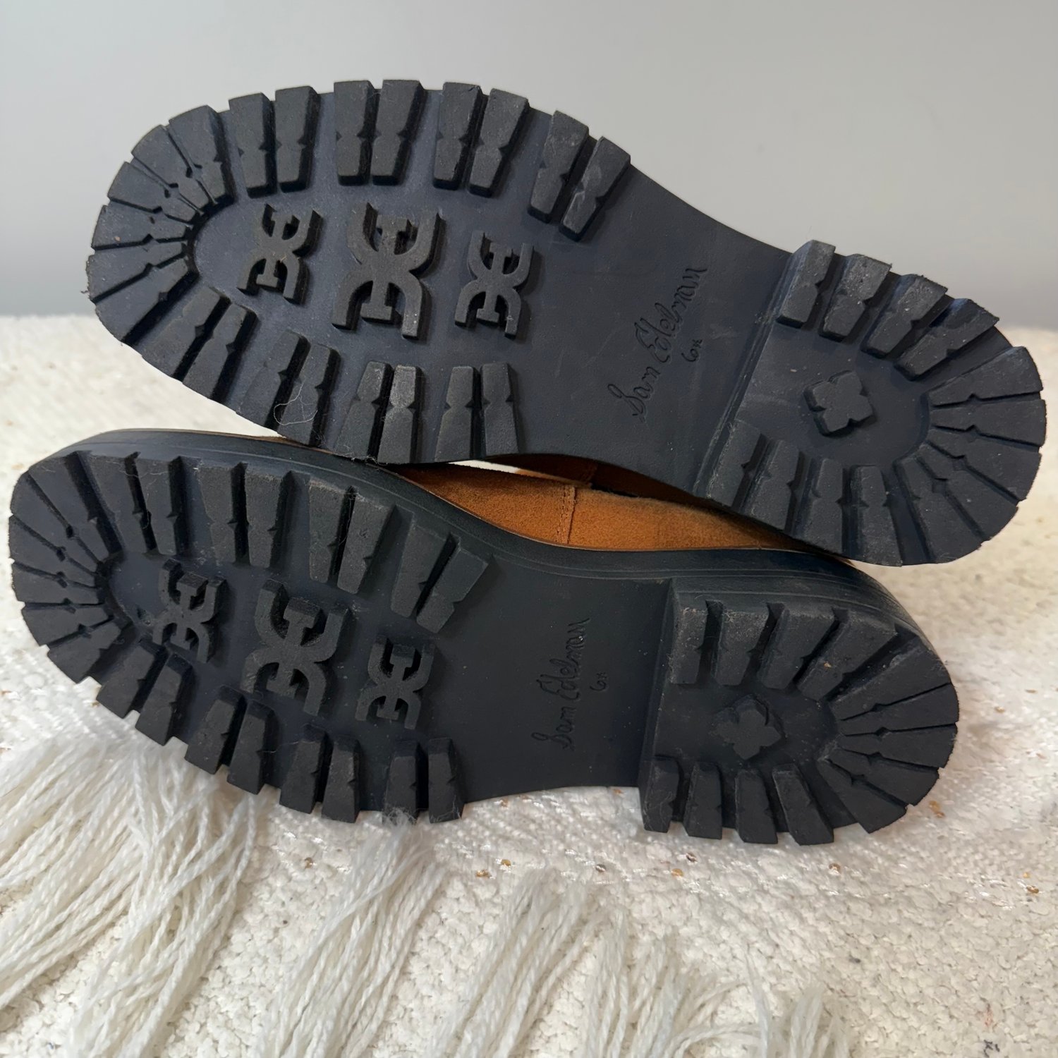 Sam Edelman brown suede pull on ankle boots with rugged soles.