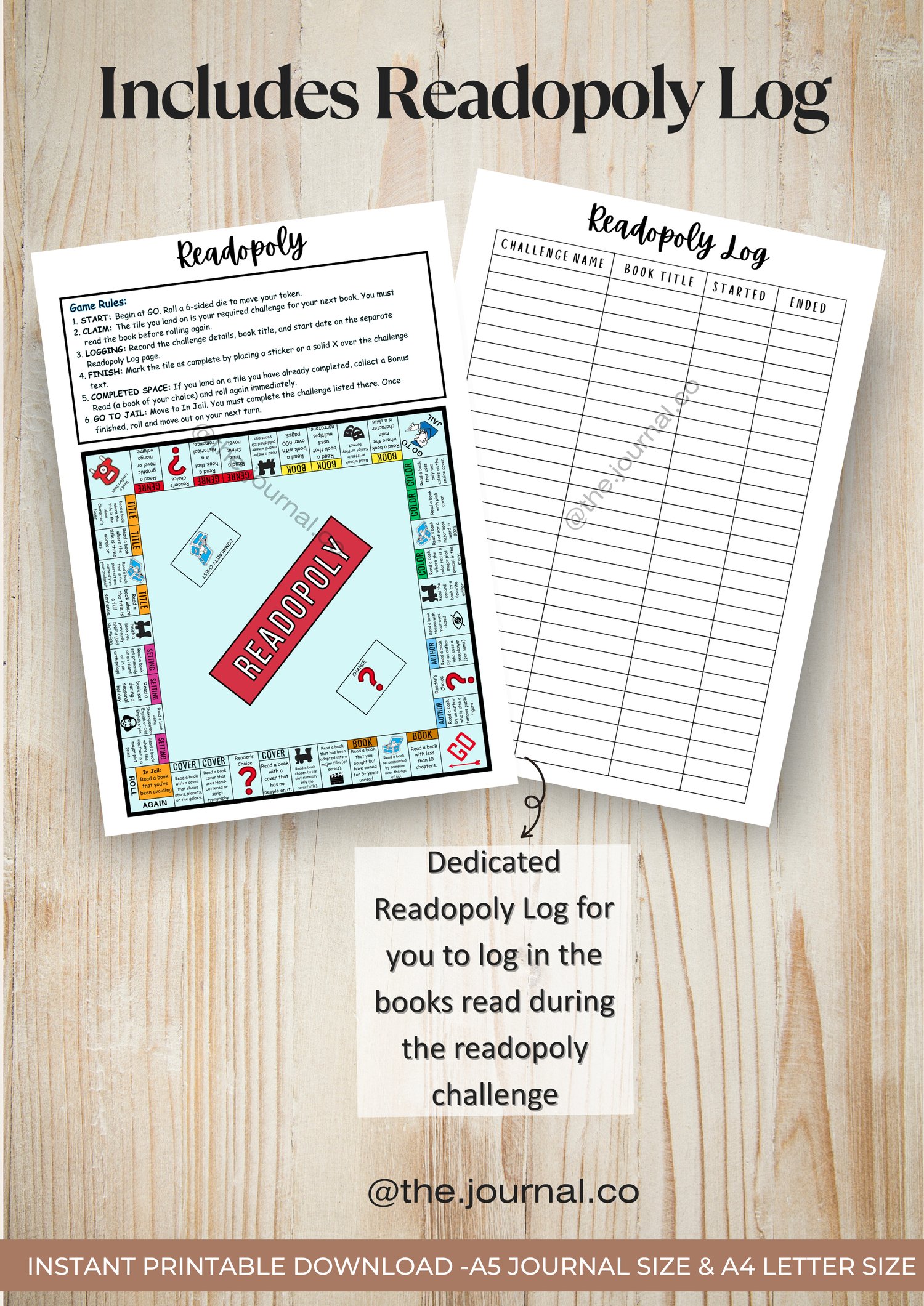 - Includes the separate Readopoly Log Page to easily track all book details, start/finish dates, and challenge fulfillment.