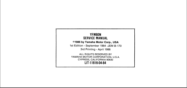 1984 Yamaha YFM80N Service Manual Part No. LlT-11616-04-84