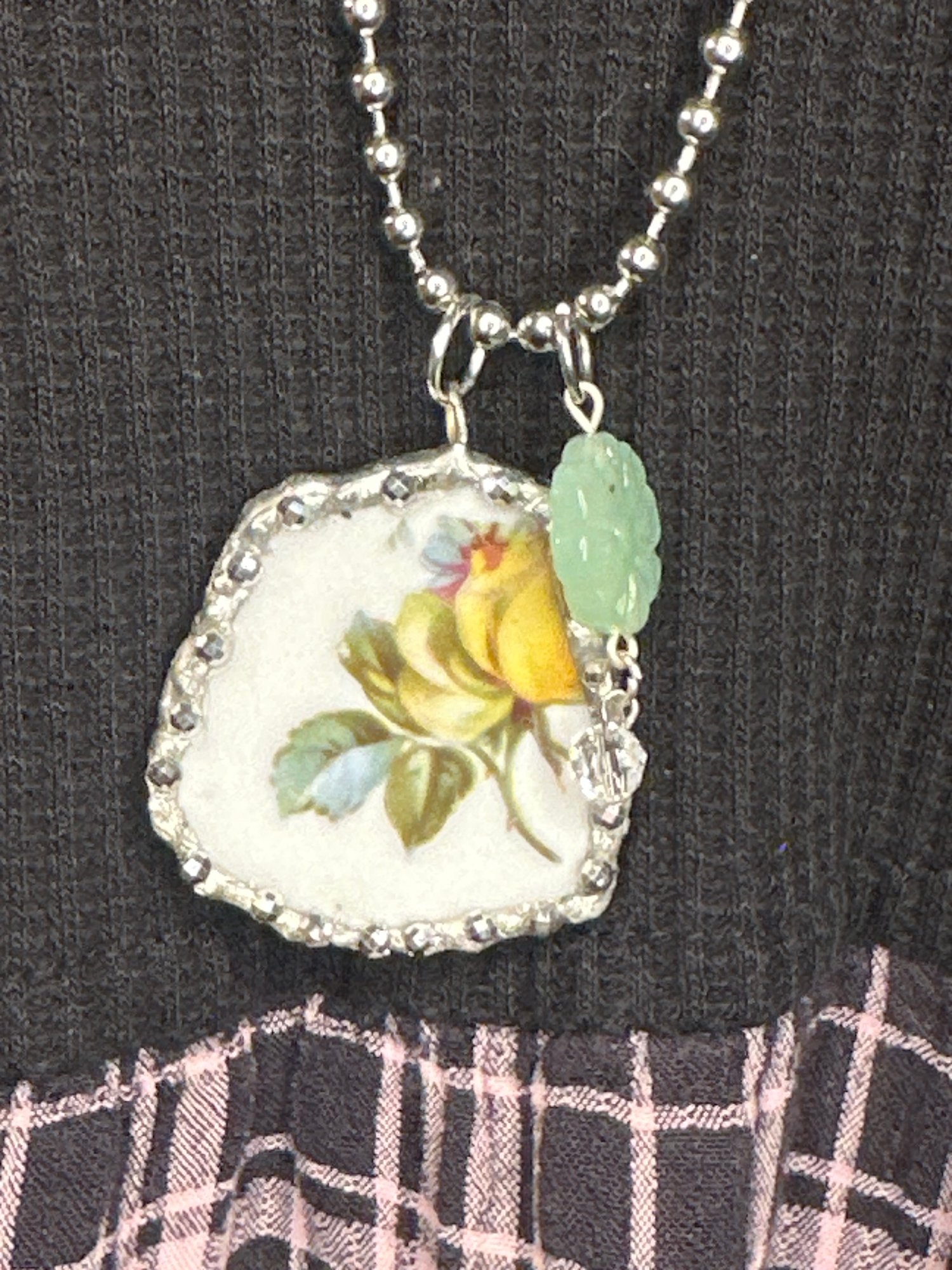 This romantic necklace is crafted from a hand-cut shard of vintage china featuring a delicate yellow rose with green leaves and soft pastel accents. The round-edged pendant is framed in silver solder with sparkling faceted detail. A carved mint-green bead and a crystal drop charm complete the look, adding elegance and a touch of whimsy. Perfect for lovers of florals, vintage treasures, and meaningful one-of-a-kind jewelry.