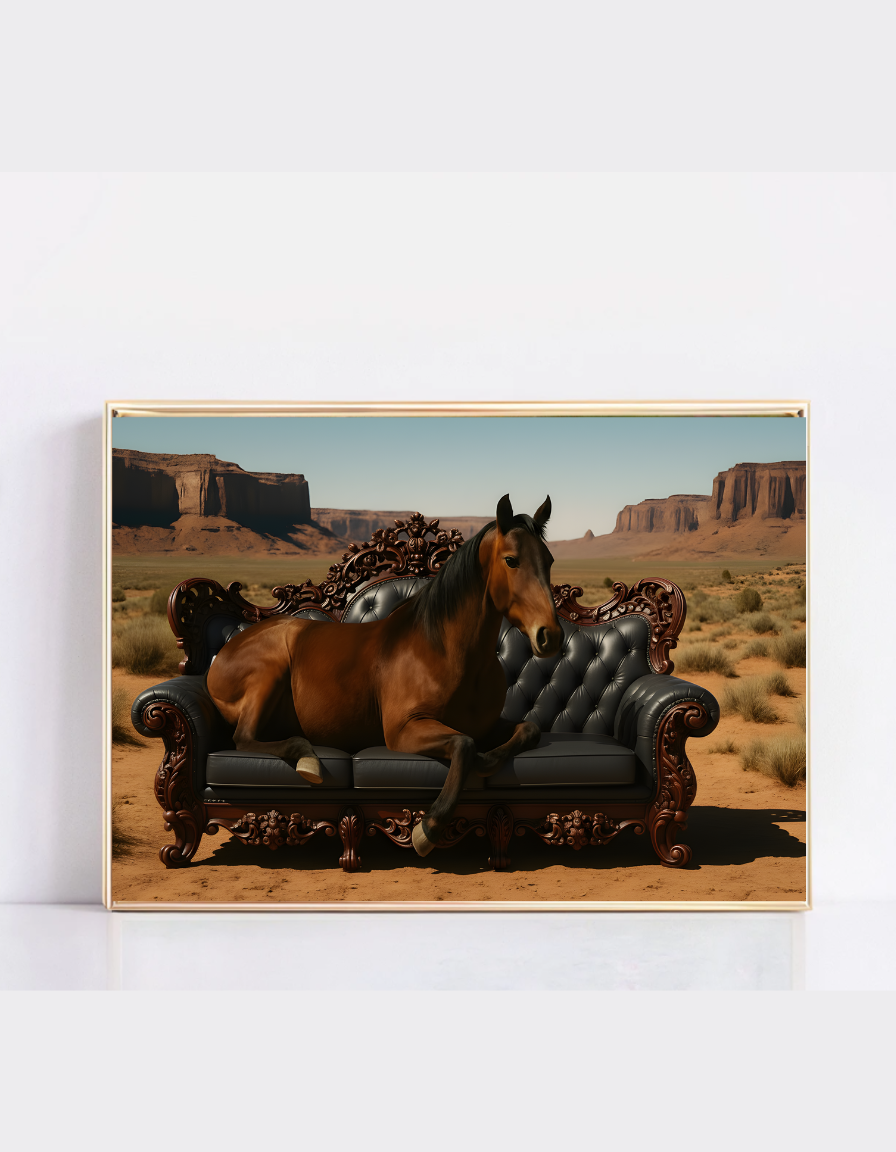 Transform your space with this captivating Horse on Sofa Wall Art – a surreal masterpiece featuring a majestic brown horse relaxing on an ornate Victorian sofa amid the breathtaking red rock formations of a desert landscape, like Monument Valley. This funny horse print blends whimsy and elegance, making it the perfect surreal horse art for horse lovers, animal enthusiasts, or anyone seeking unique animal home decor.