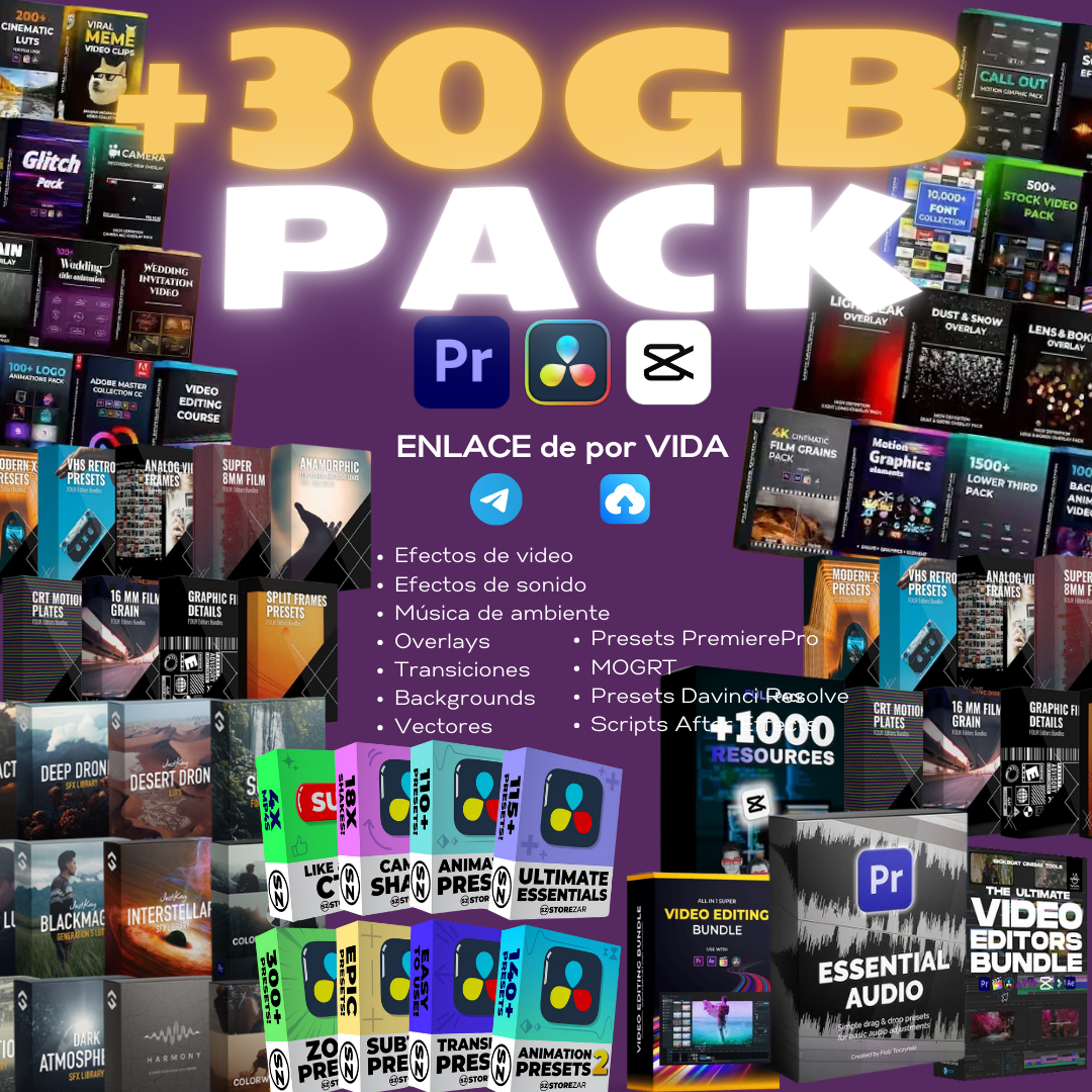 Presentamos el Pack de +30 GB mas avanzado para aquellos que les gusta los programas de Premiere Pro y After Effects, y para completar este increíble pack lo acompañamos con unos recursos para edición en VFX y SFX que no puede faltar en tu biblioteca: