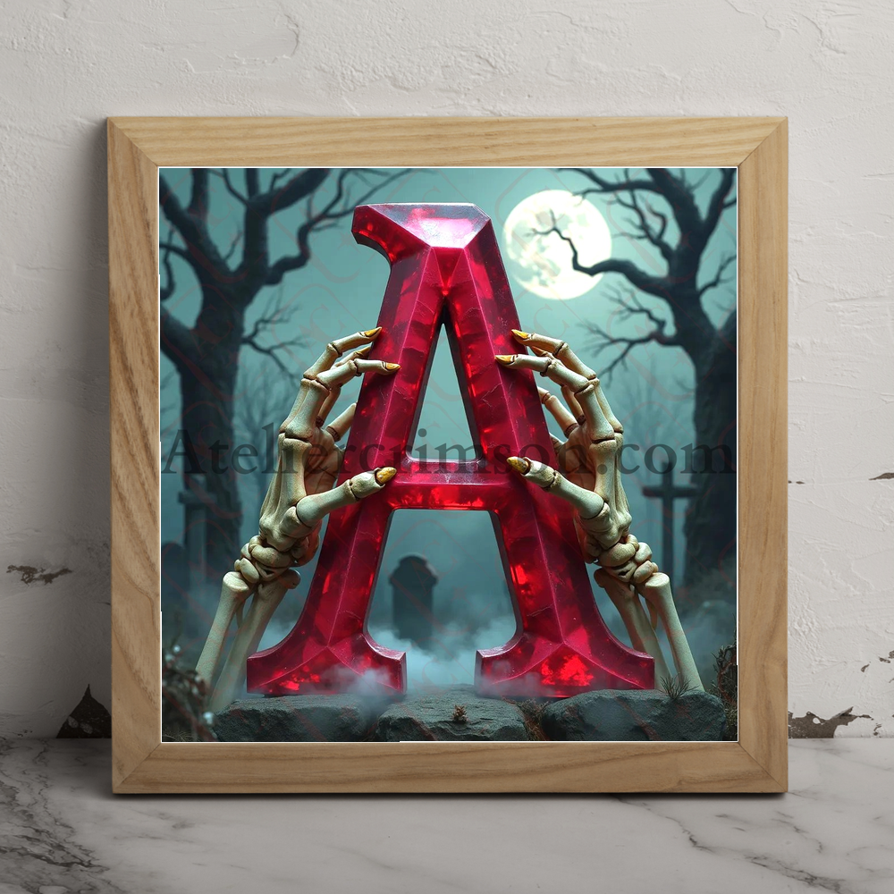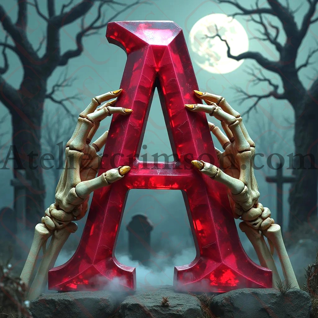 The letter A ruby halloween skull Discover our eerie alphabet series featuring photorealistic ruby letters and numbers. Each character, crafted from deep red gemstone, floats mysteriously in a misty graveyard. Skeletal hands frame these gleaming symbols against a moonlit, Halloween-inspired backdrop. Perfect for gothic design projects or seasonal decor inspiration!