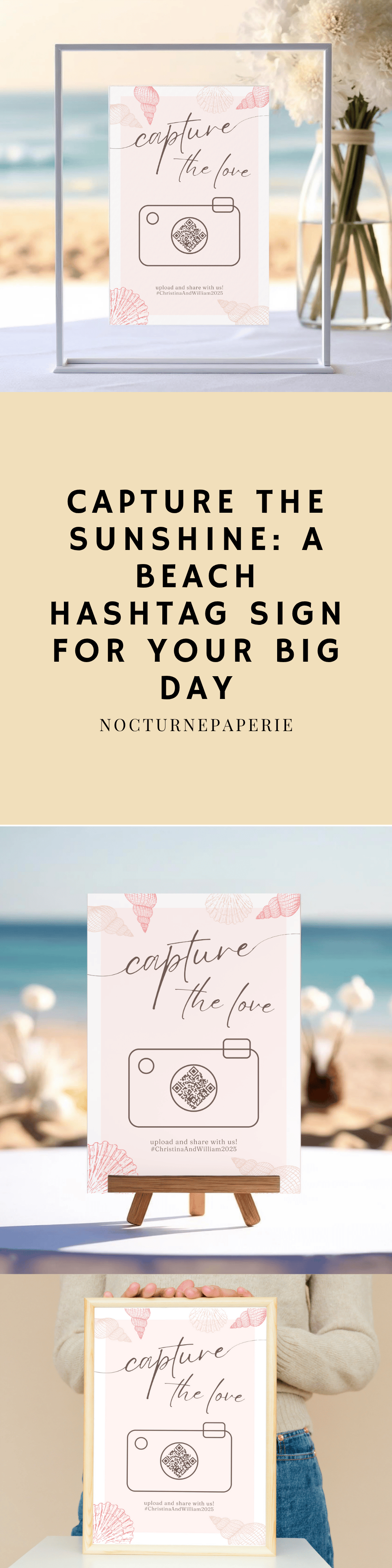 Bring a coastal vibe to your celebration with this beach wedding QR code sign featuring a sunny summer theme. This editable Canva template makes photo sharing effortless while adding a stylish touch to your guest tables. It’s part of our seasonal collection on NocturnePaperie—explore other seasons like Winter, Spring, and Autumn.