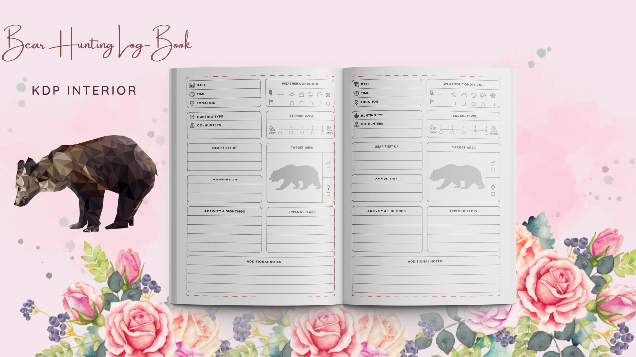 Bear Hunting Log Book Interior is perfect to start your KDP business, with beautiful design and structural elements, It is ready to upload or even print for your daily drawing,
