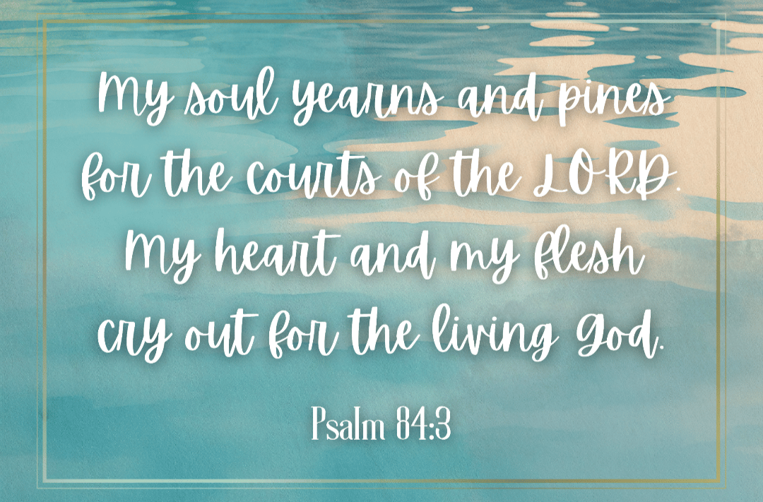 A peaceful, contemplative Scripture print featuring Psalm 84:3—“My soul yearns and pines for the courts of the Lord…”—set against a serene watercolor reflection background in soft greens, blues, and golden tones. The gentle movement of the water pairs beautifully with the longing expressed in the verse, creating a calming piece perfect for prayer corners, home chapels, or quiet reading nooks.