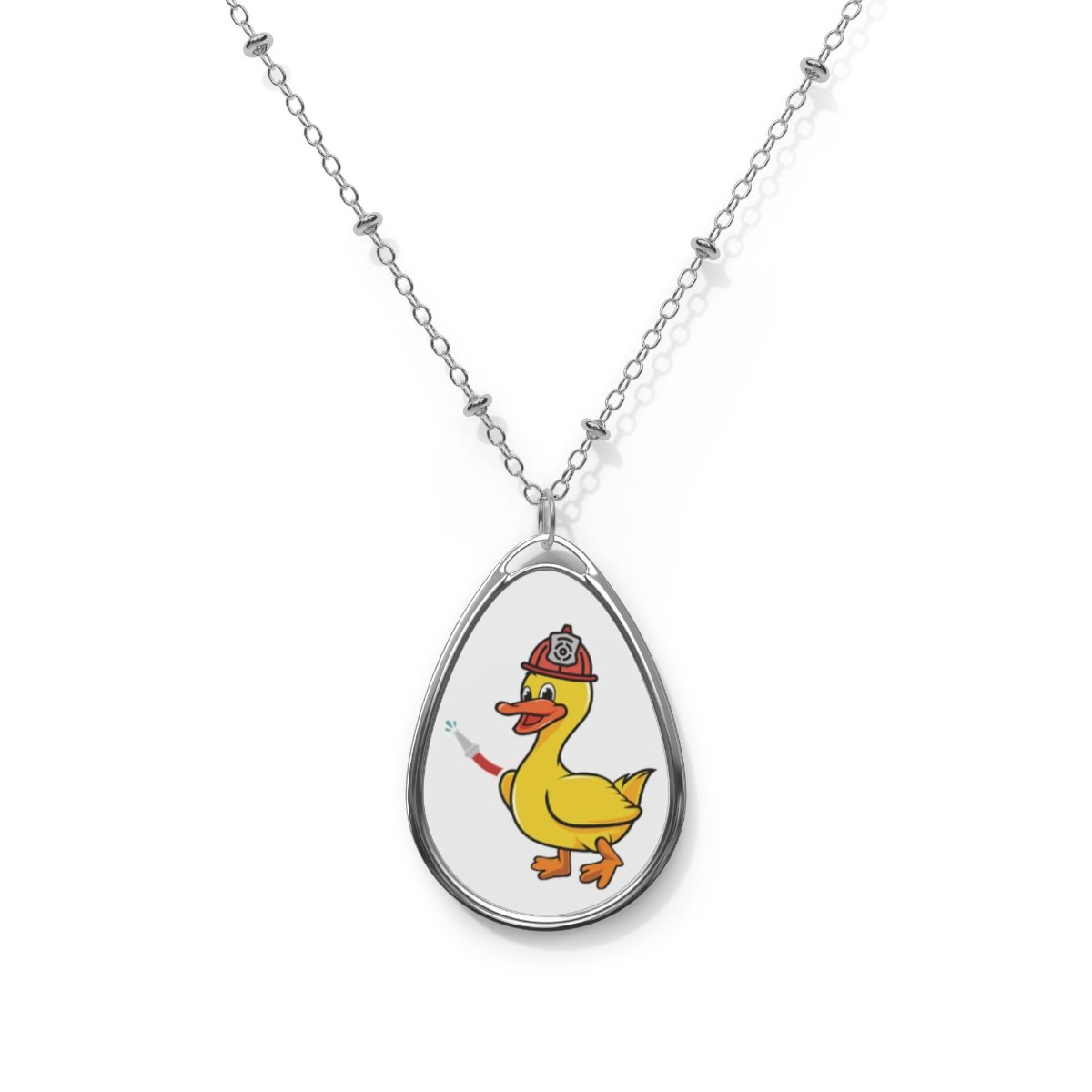 This necklace features a duck design dressed in firefighter gear, set against a glossy oval backdrop. Its modern ellipse shape adds a stylish touch, making it ideal for casual outings, special occasions, or as a thoughtful gift for loved ones. Whether you're honoring a firefighter in your life or simply showcasing your love for cute, meaningful jewelry, this piece is sure to stand out and bring a smile.