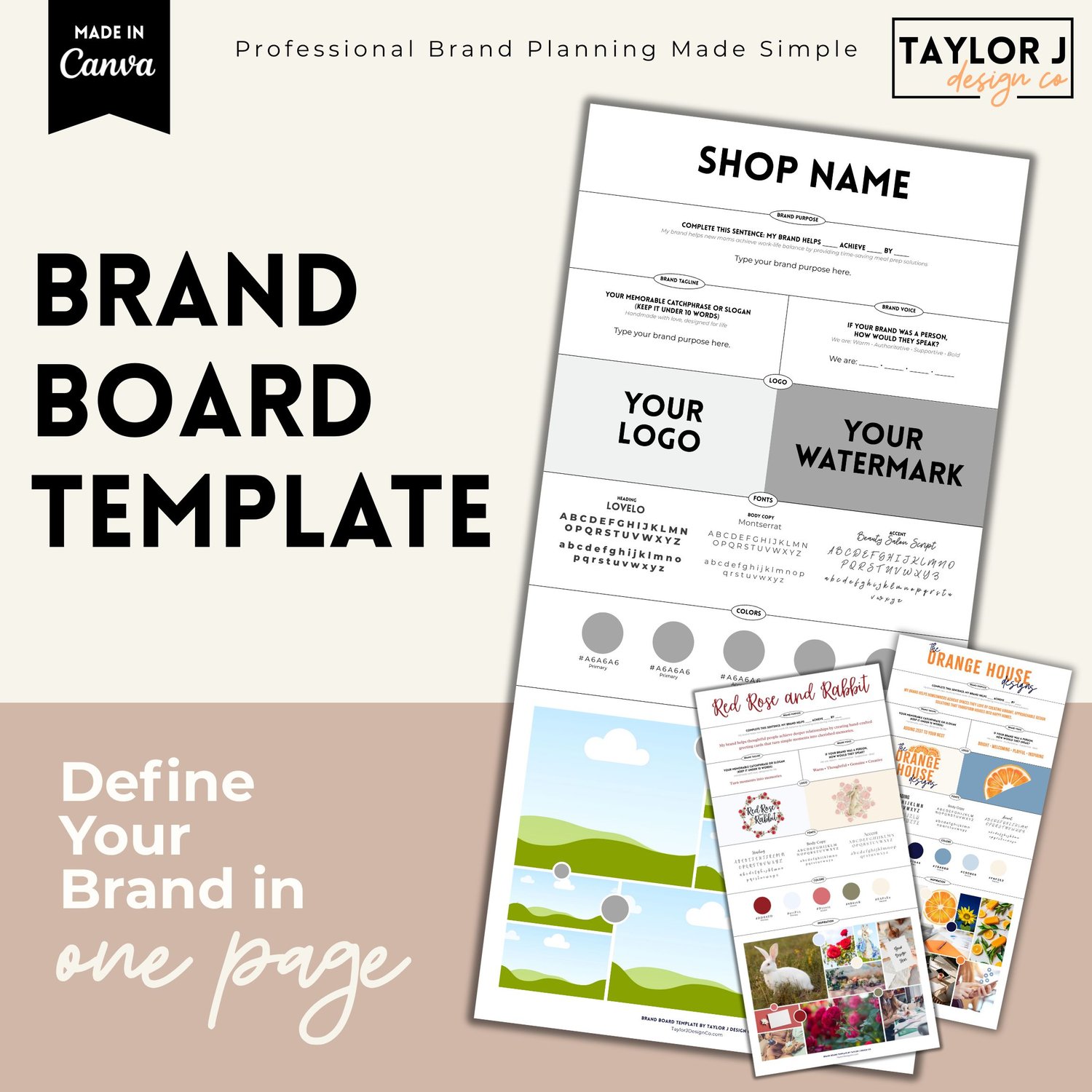 Complete brand board template in Canva, Step-by-step "How to Use" guide, Professional layout with 6 key sections: