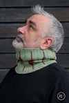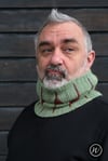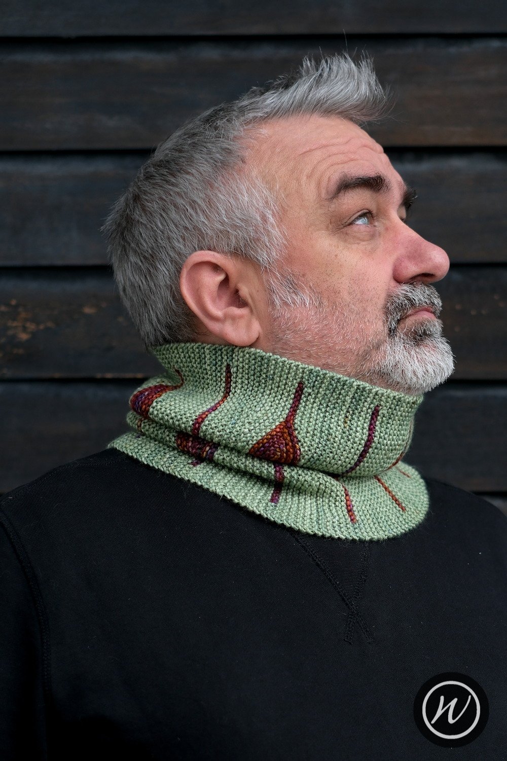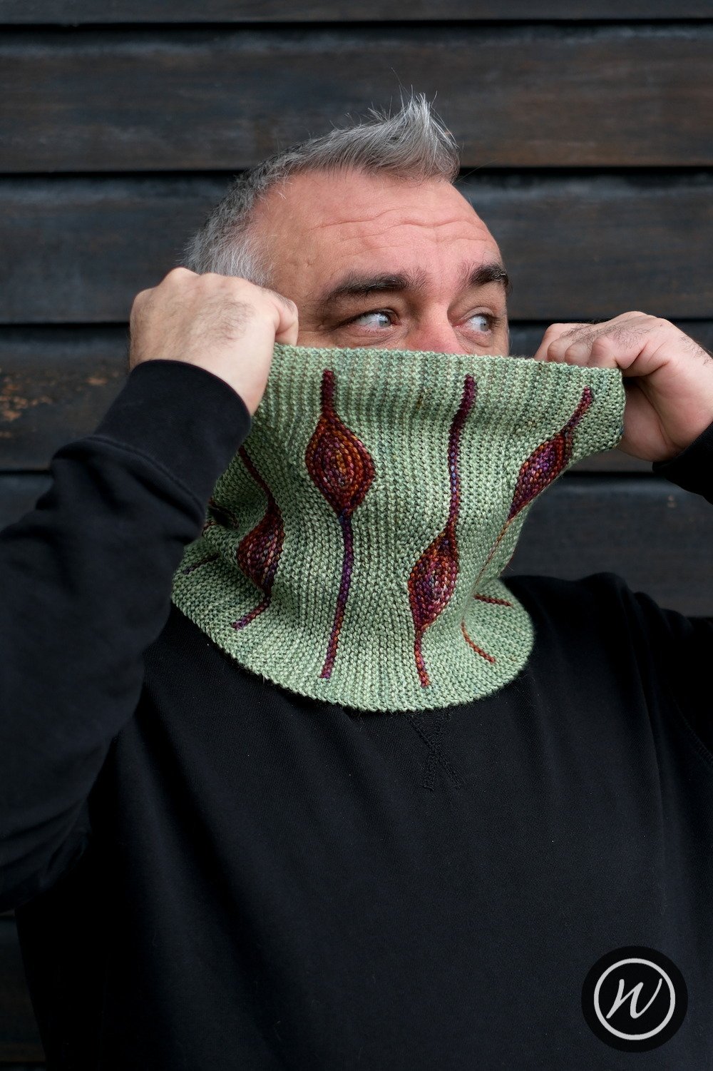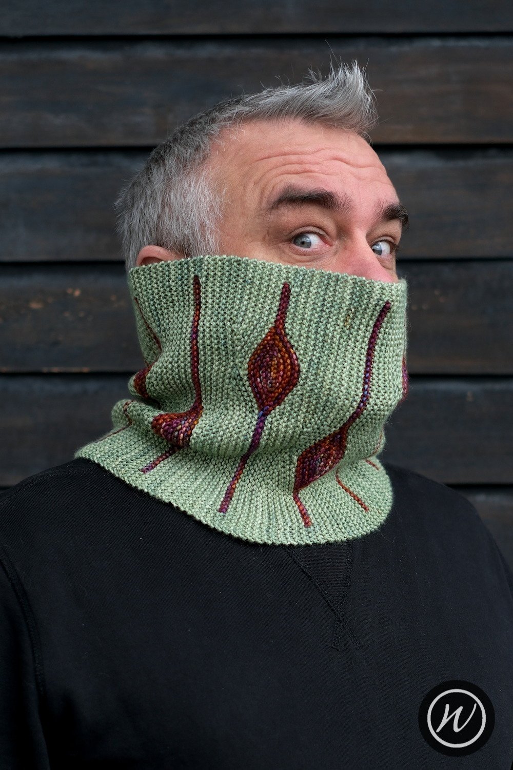 Equilibria Compagne is a sideways knit cowl or scarf. It uses short-row colourwork to create a motif of alternating leaves on stalks, which are then repeated all around. It’s worked in garter stitch throughout.