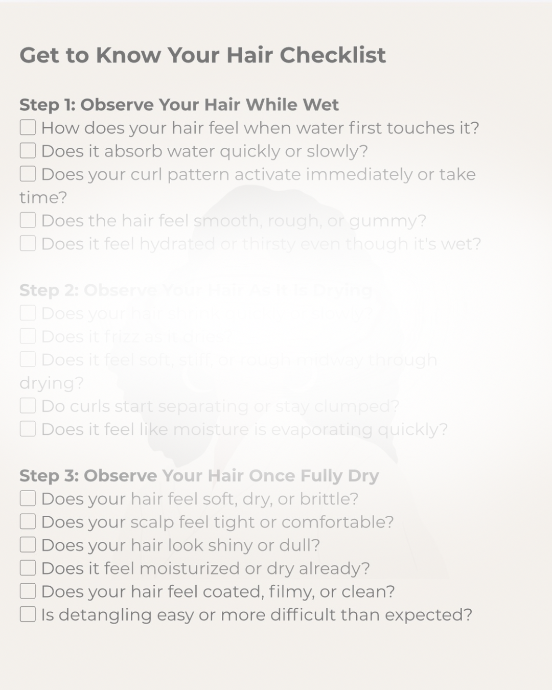 Stop guessing and start observing. This digital checklist walks you through exactly what to look for while your hair is wet, drying, and fully dry so you can make better product choices and build a routine that actually works.