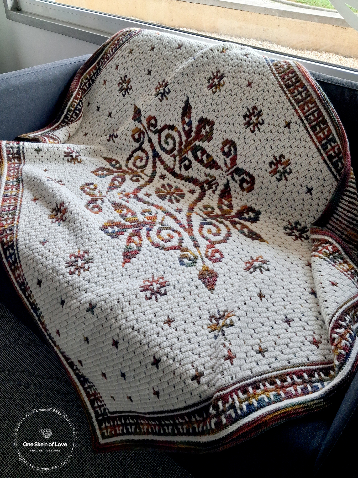 A sky full of stars was my inspiration for this blanket. It turned out so elegant, just like I wanted it to be. The pattern will work nicely in only 2 colours or in as many colours as you like. it is also great for gradient yarns or cakes.