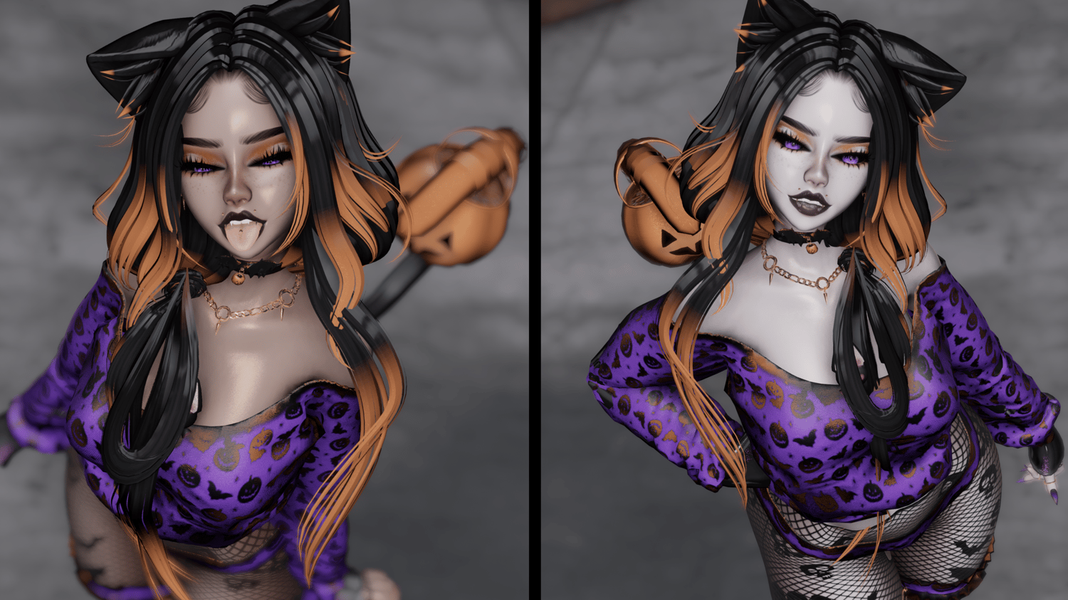 Av3,Gogo,Index,Mat caps, Hair textures, Body + Head (all sculpts and textures are custom and not for reuse)Baby hairs, tattoo hairs (nessy + navv+bunisu), hoodie, bat earrings, shorts, bodysuit, candy corn tail and ears, bat boppers, garters, chunk boots, boxers, sweater fangs cat tail texture, pjs and slippers nip rings bra earrings choker witch hat choker pasties panties and jumper bat plush fishnet, cookies pumpkin head cat ears booties chunk boot