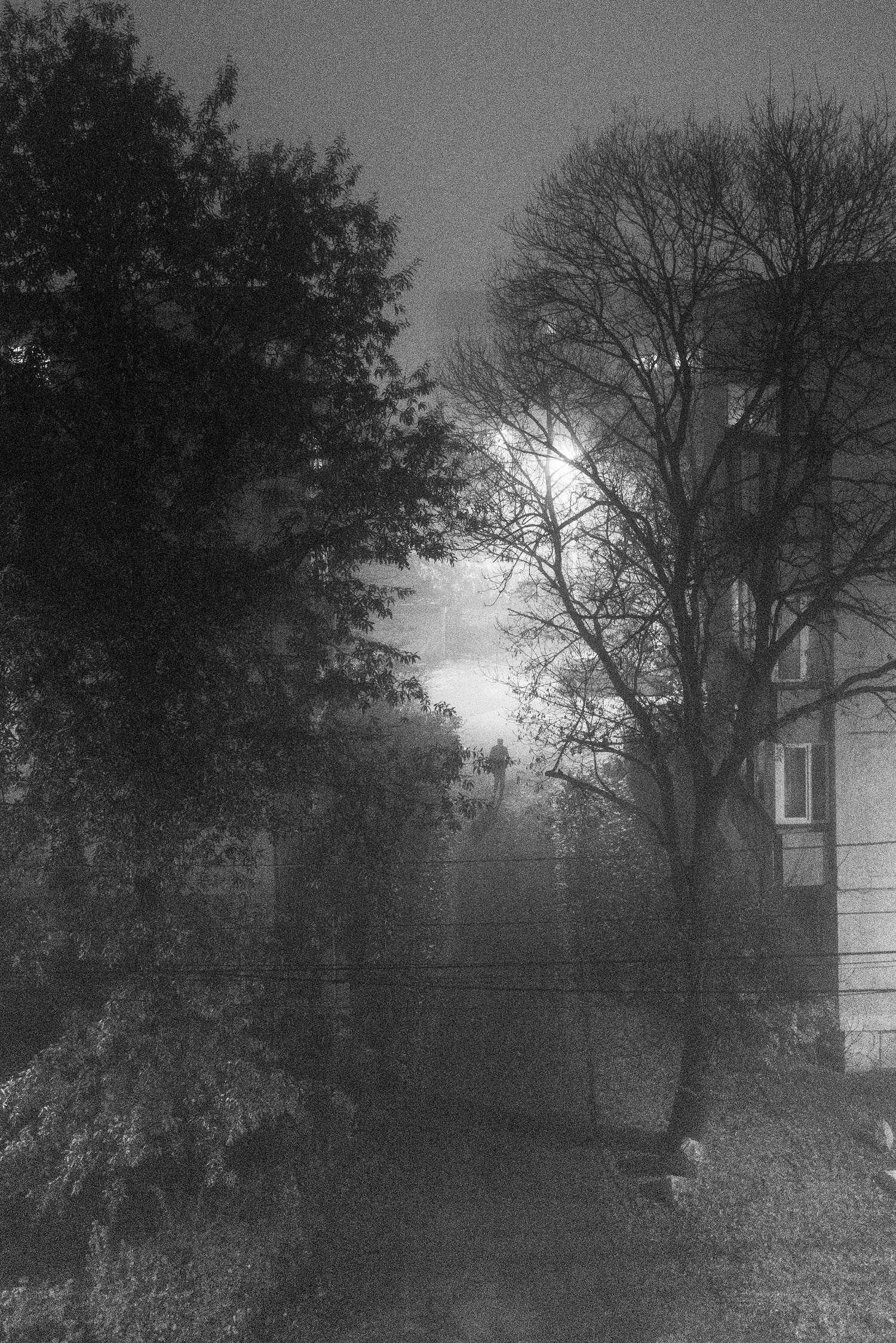 A dramatic black-and-white night scene captured through dense fog, where a lone silhouette walks down a narrow path illuminated by a distant streetlight. The heavy grain and high contrast give the image a cinematic, noir atmosphere perfect for moody wall art or storytelling projects.