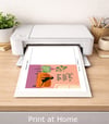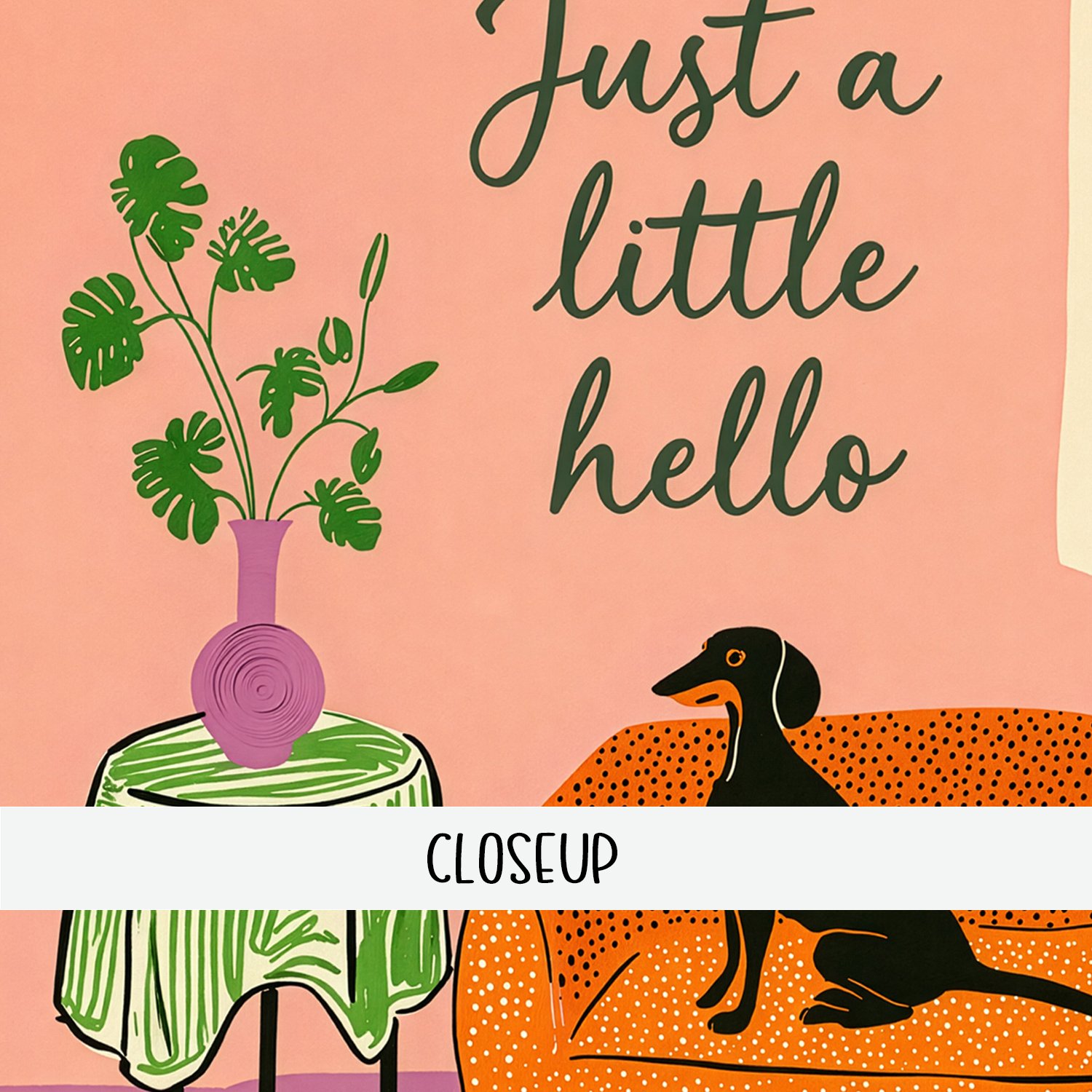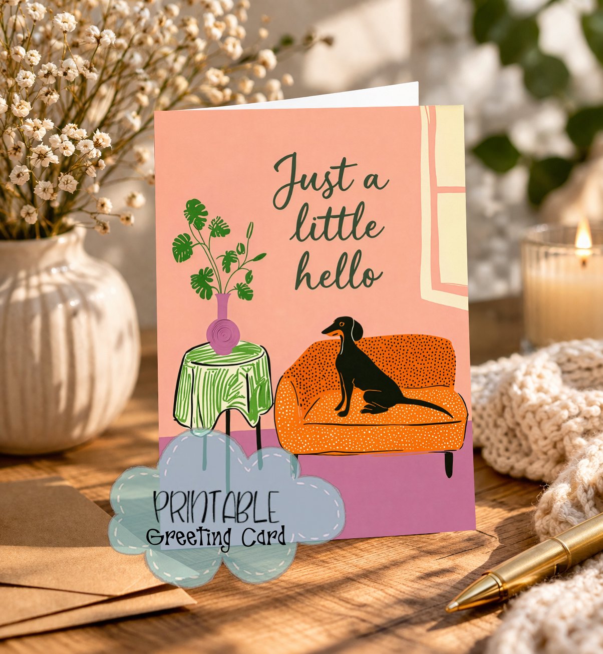 A cheerful and playful printable greeting card featuring a cozy illustrated scene with a sweet dog lounging on a patterned sofa, paired with the message “Just a little hello.” With warm tones and a lighthearted style, this card is perfect for sending a friendly note, checking in, or simply brightening someone’s day. A charming choice for dog lovers and anyone who appreciates a cozy, modern illustration style.