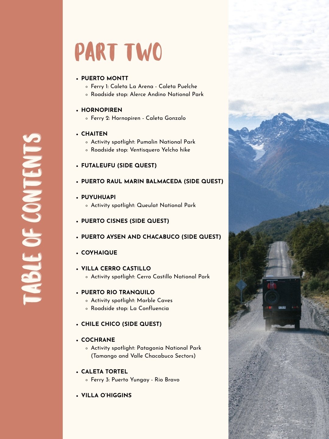 This handbook is a compilation of all my tips and knowledge about Chile's most scenic highway, condensed in one handy, beautifully designed eBook that is available to you offline (essential while on the highway!).