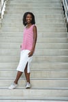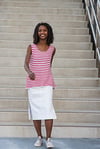 CALLA is worked in the round from the bottom up to the armholes then divided and worked flat to the shoulders. A stockinette stitch/reverse stockinette stitch striping sequence is worked throughout.