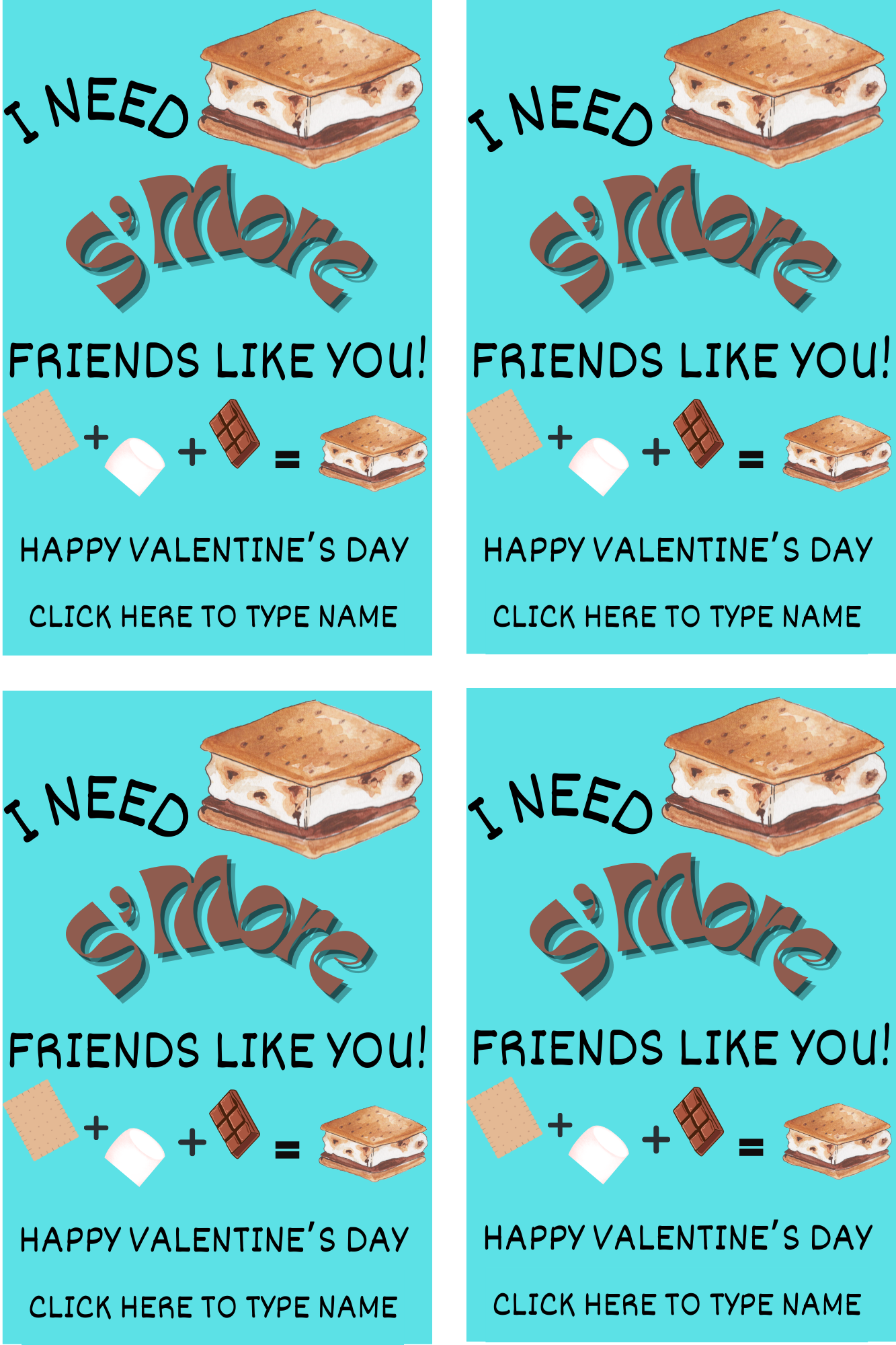 S'mores valentines, fun classroom valentine printable, instant download, add name and print .... 4 cards per page