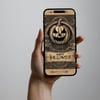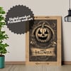 A digital file for printing; Horror pumpkin face for Halloween party. Wallpaper cellphones or card invitation. Scary pumpkin halloween art decoration vintage poster.