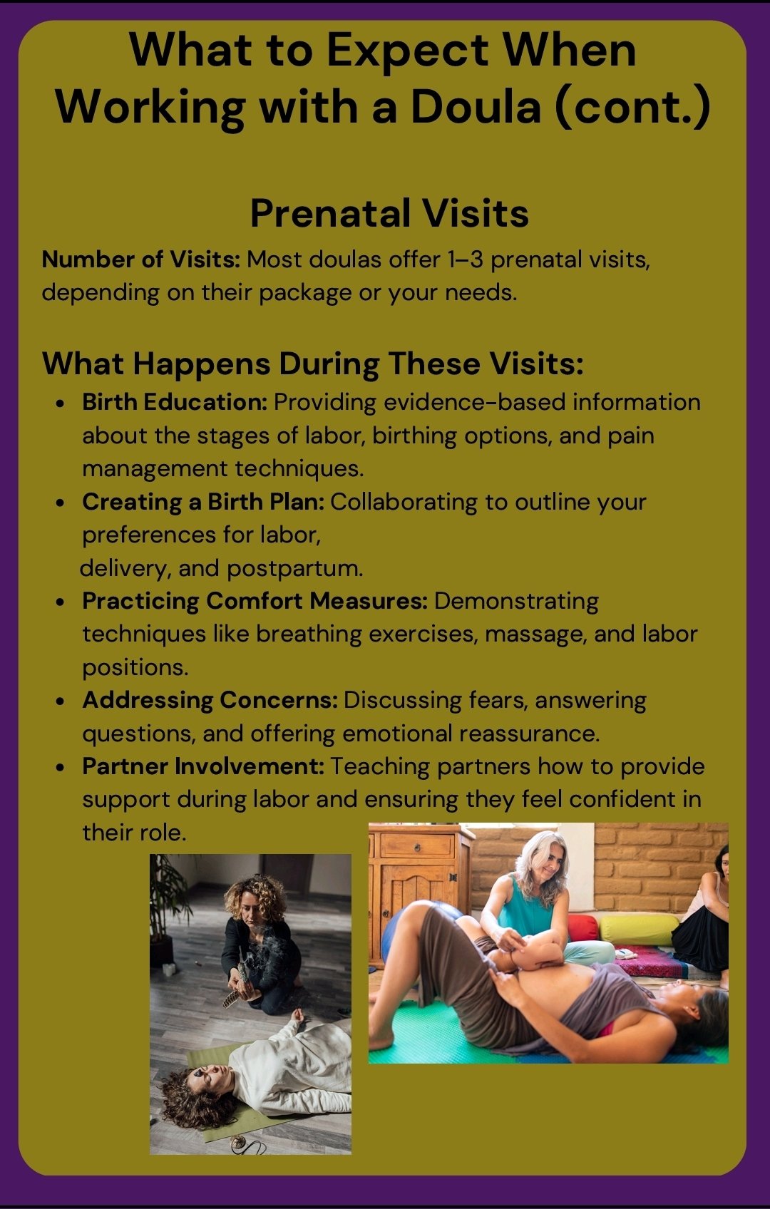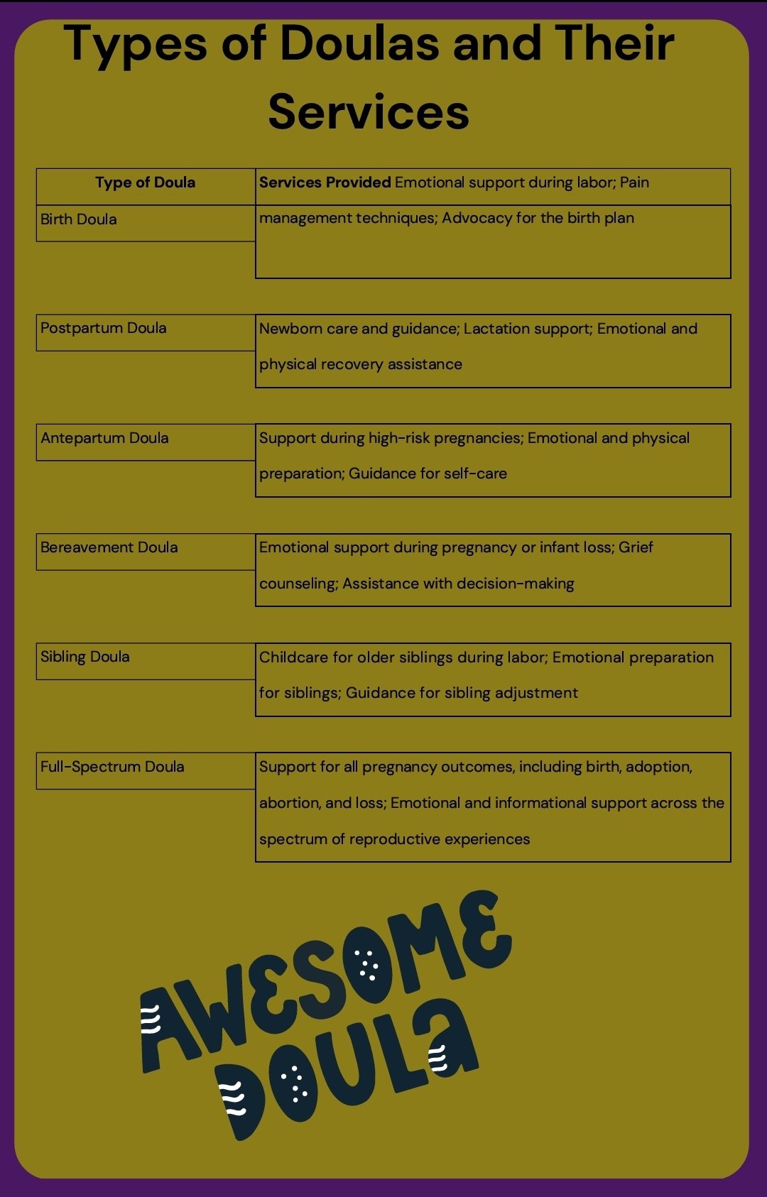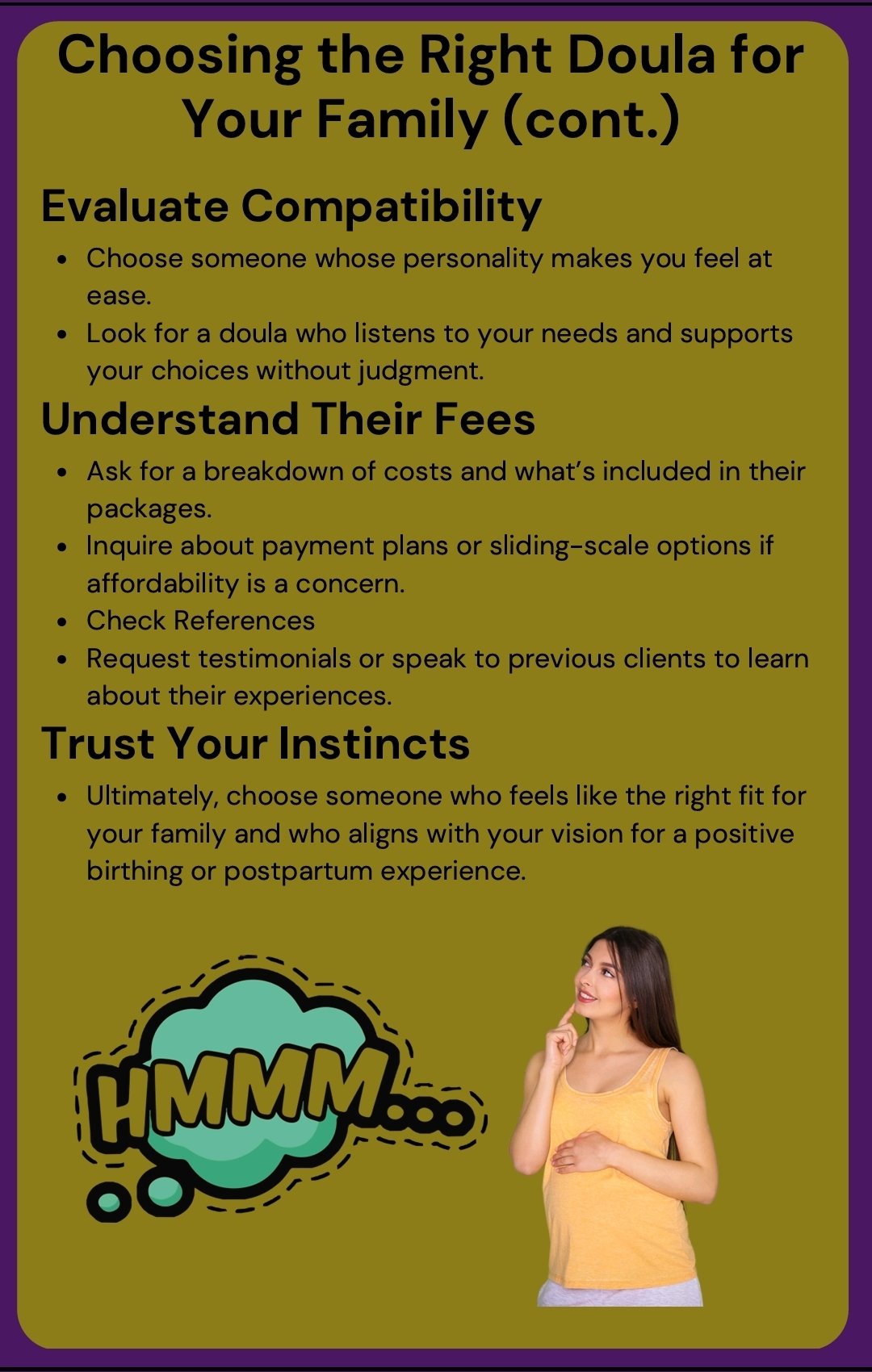 - A clear breakdown of the roles of doulas, midwives, OBs (and when you might want all three!)